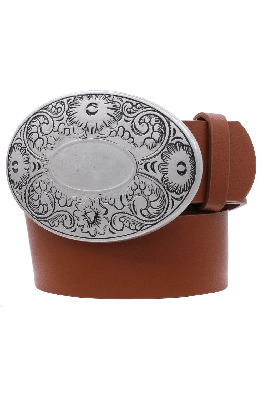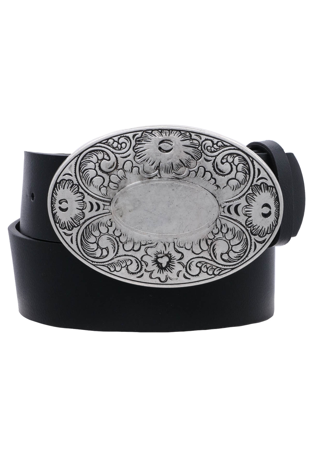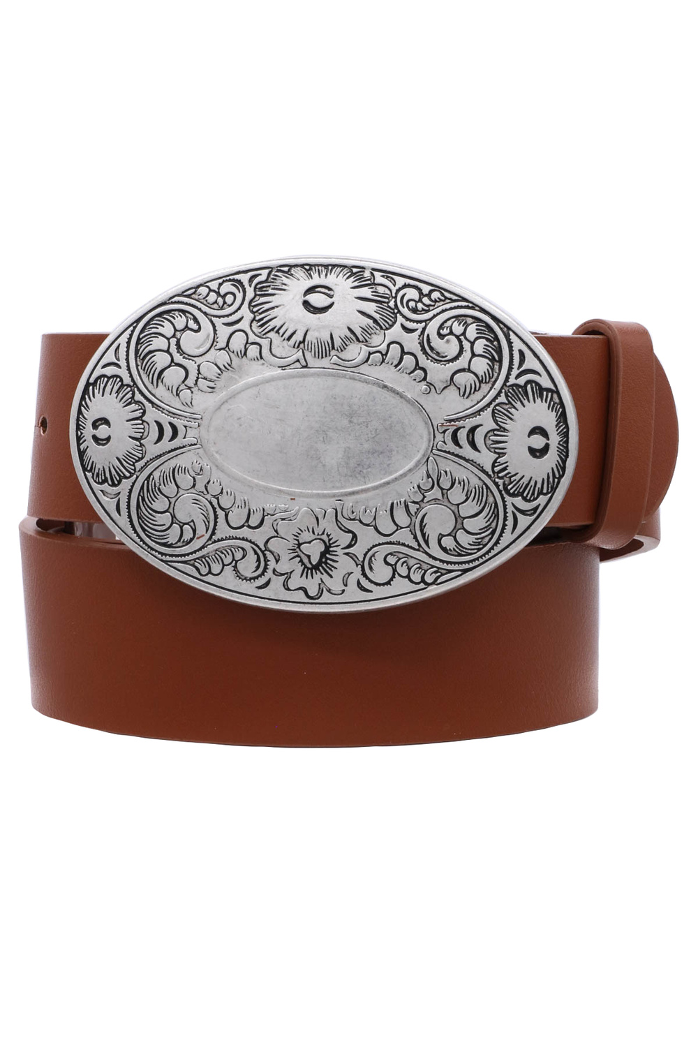 - Southwest-inspired belt featuring a faded bloom design with an oval buckle accent. A stylish statement accessory that adds rustic charm and character to any outfit.