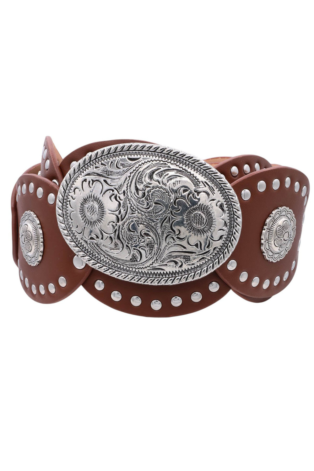 - With intricate sunflower conchos and a detailed oval flower buckle, this artisan-crafted belt adds a bold yet feminine statement to any outfit. A true blend of Western and chic.