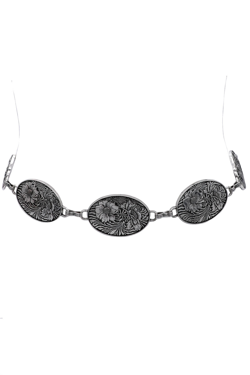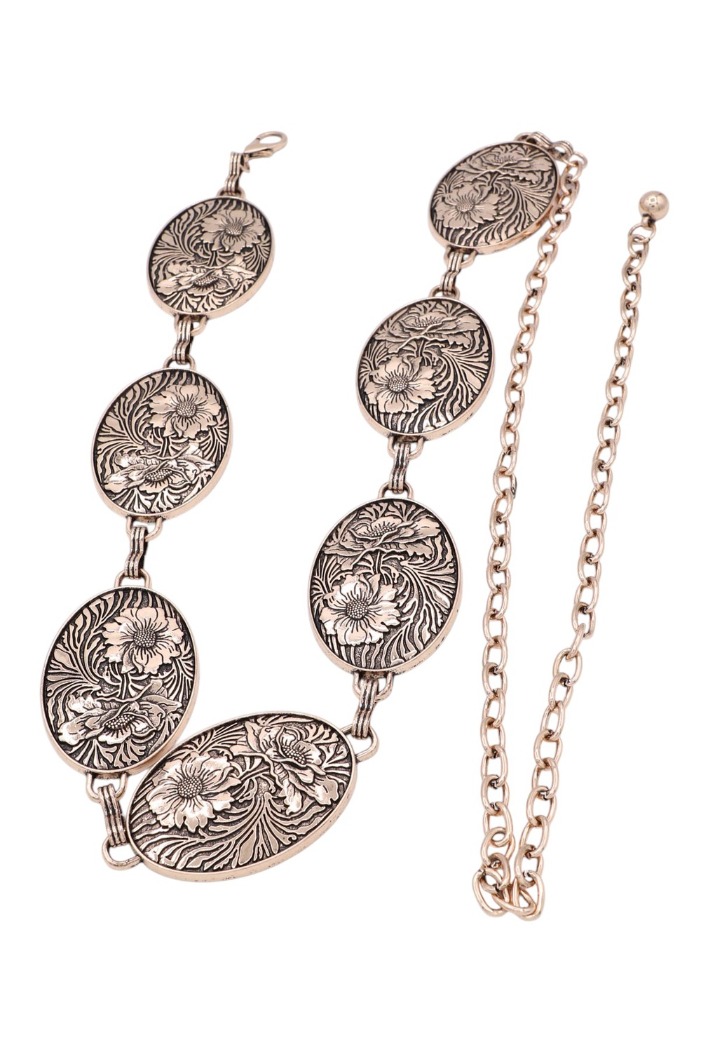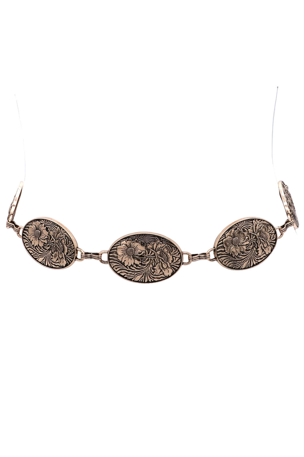 - Add a touch of Western charm with this flower-embossed concho chain belt. Featuring detailed floral engravings and linked concho stations.