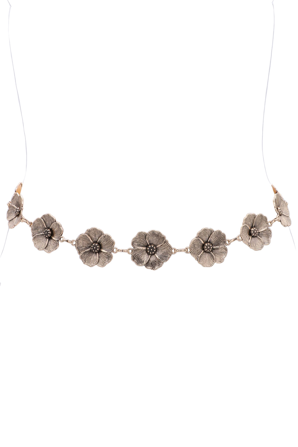 - Charming and vintage-inspired, this metal chain belt showcases delicate floral links that add a feminine and elegant touch to any outfit.