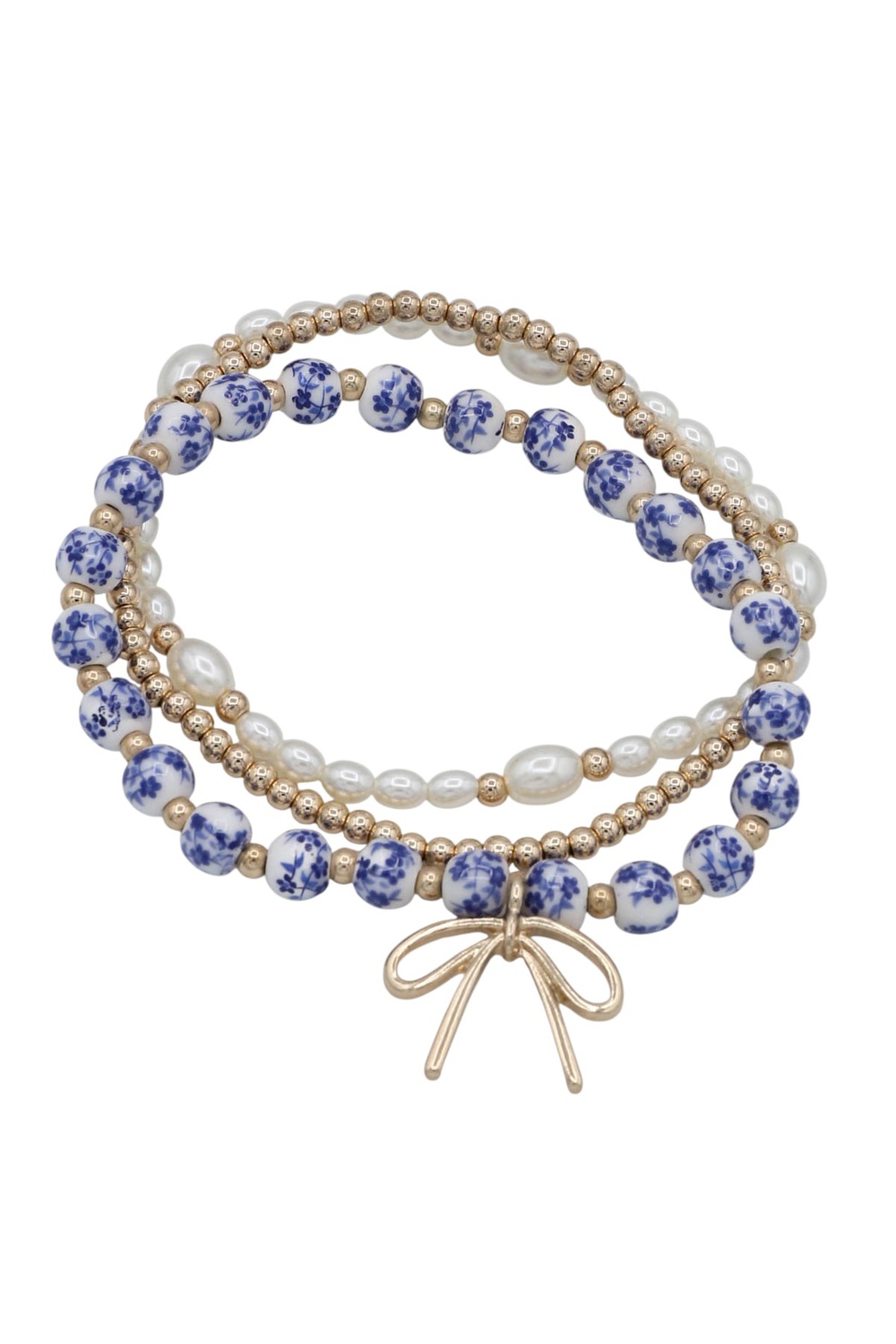 - This 3-piece bracelet set combines smooth ceramic beads with a dainty bow charm for a feminine, layered look.