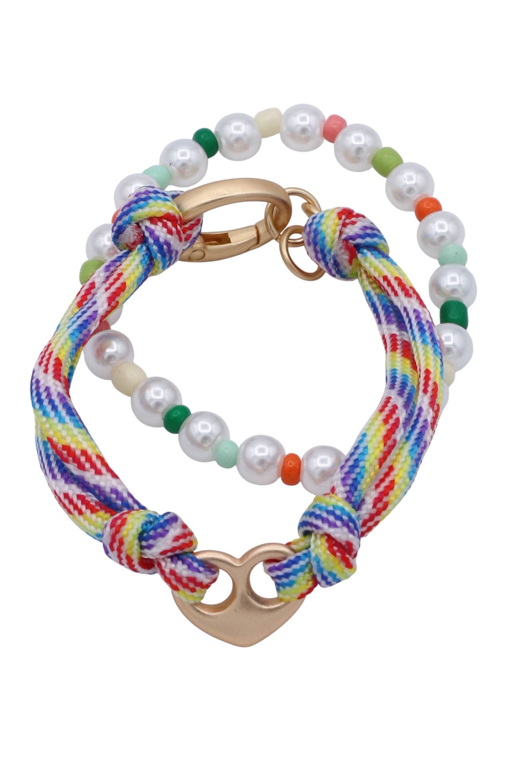 - A charming two-piece bracelet set featuring a beaded elastic bracelet paired with a cord design, finished with a heart accent. Perfect for stacking or sharing.