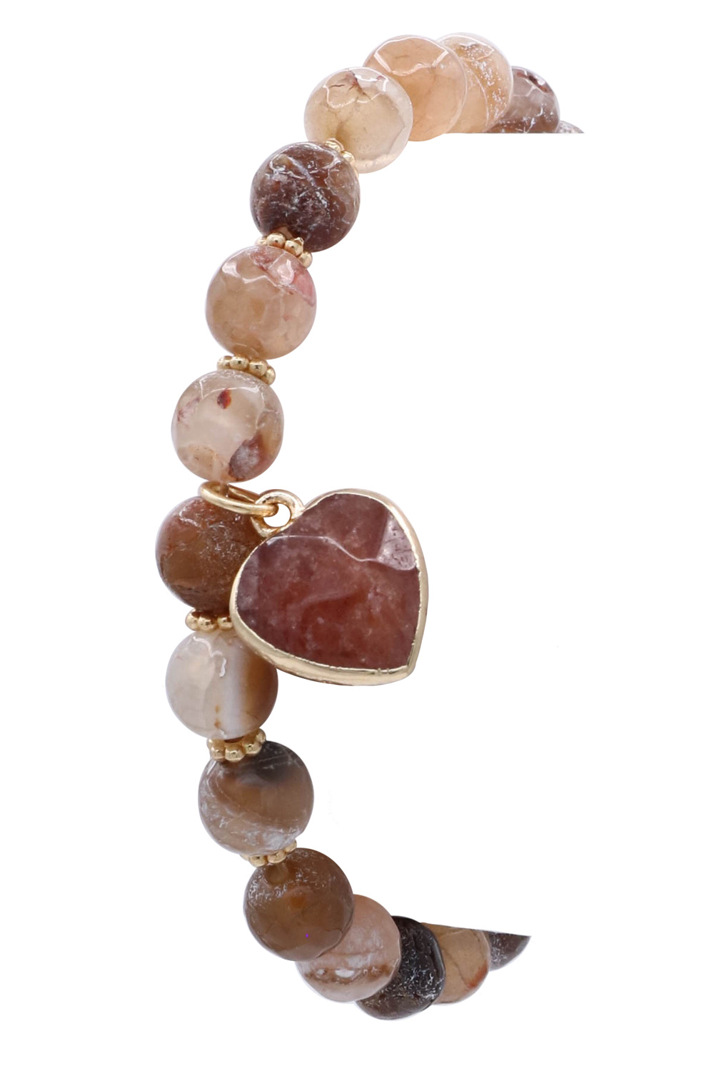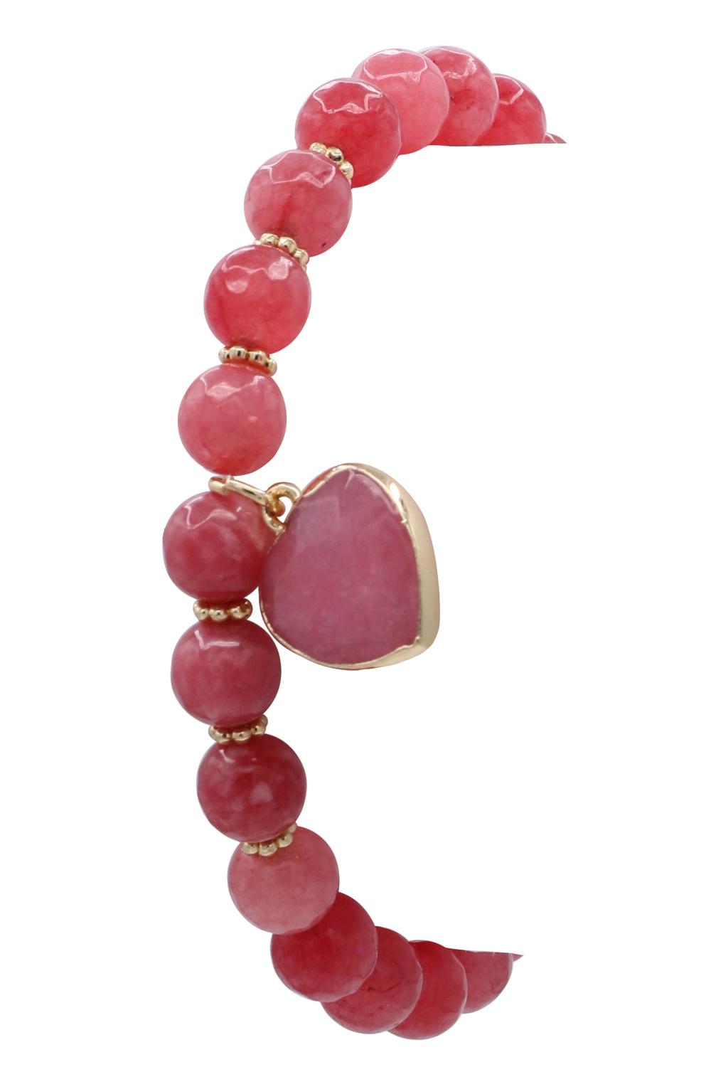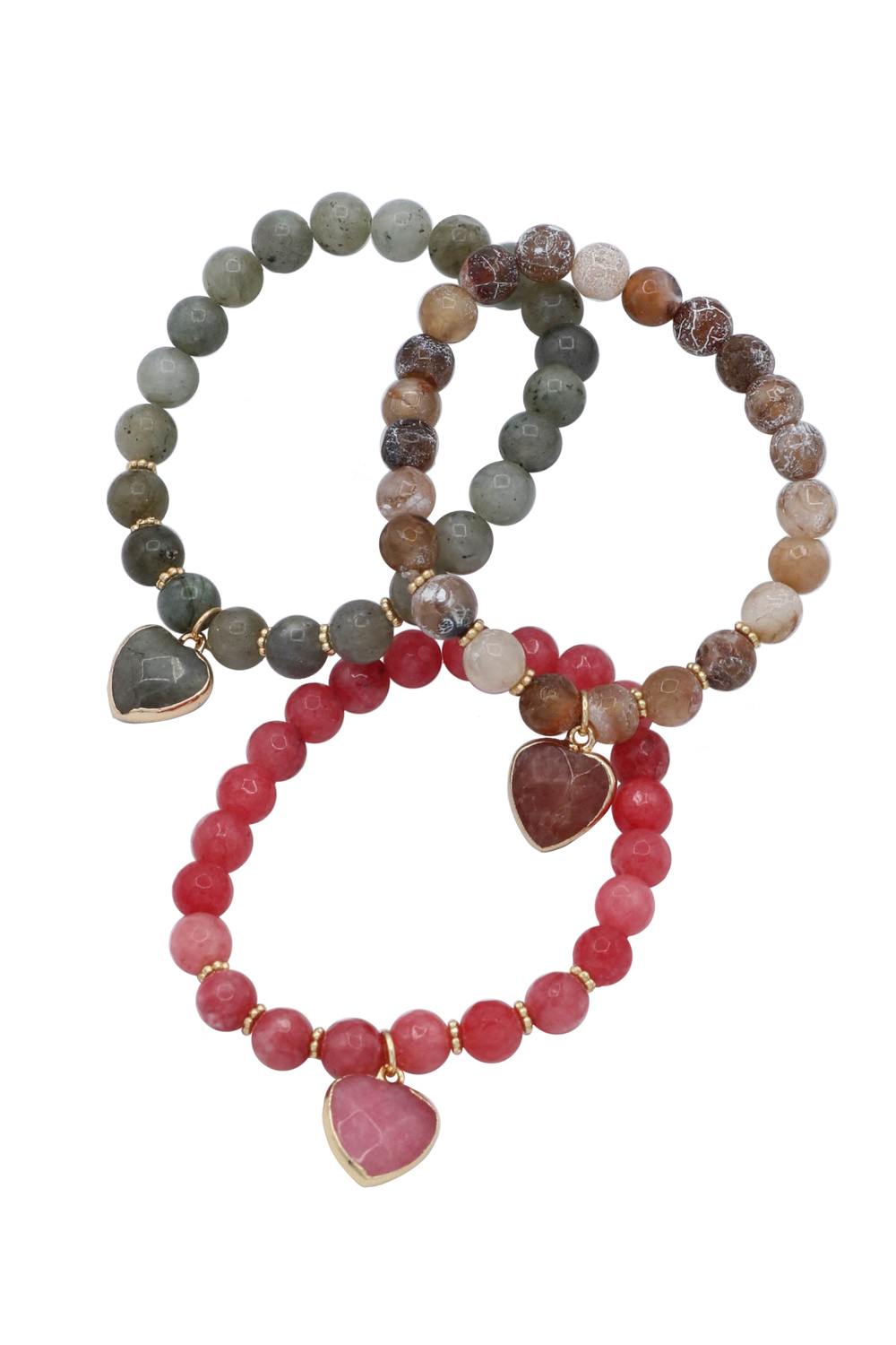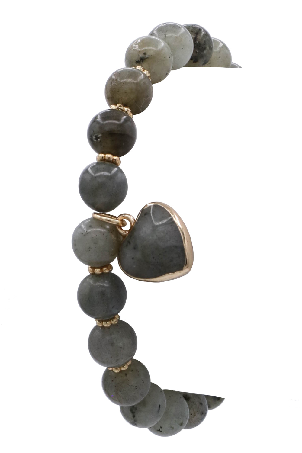 - Stretch bracelet featuring glass beads accented with a heart charm. Comfortable, lightweight, and easy to wear.