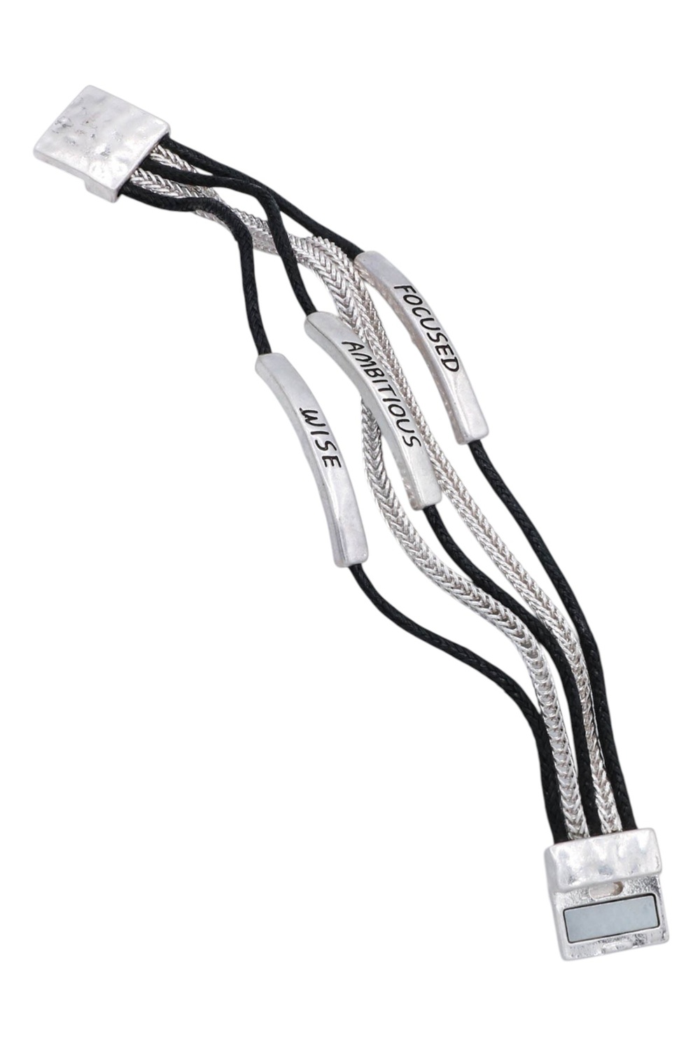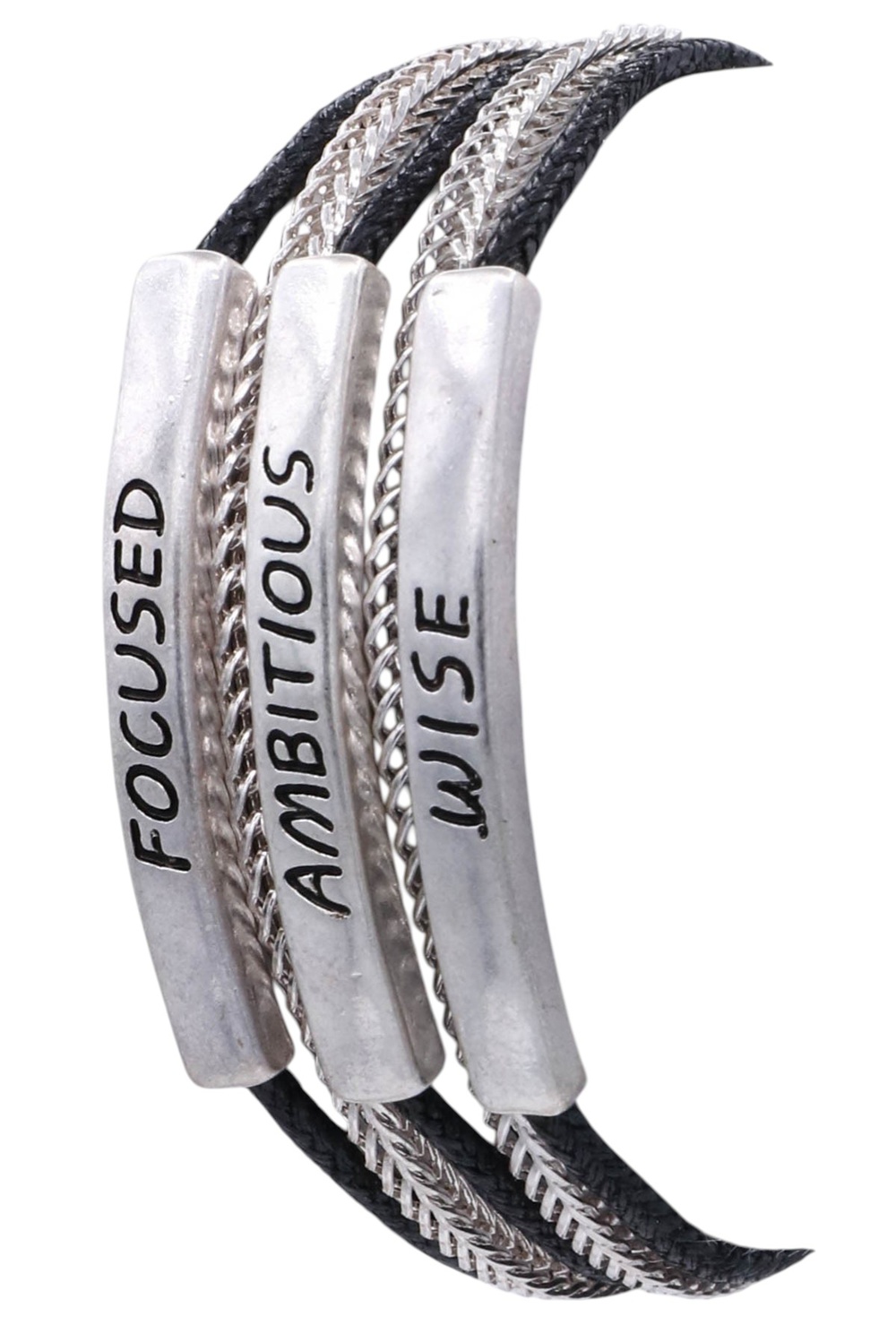 - A meaningful bracelet featuring a sleek metal plaque engraved with the words "Focused, Ambitious, Wise." This motivational piece is perfect for everyday wear or gifting, serving as a stylish reminder of strength and purpose.