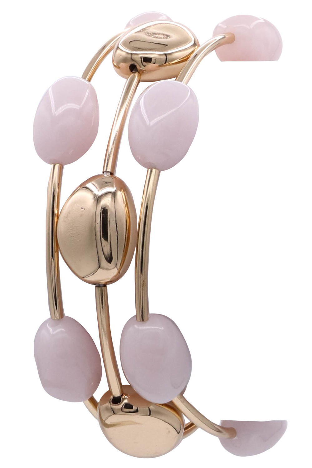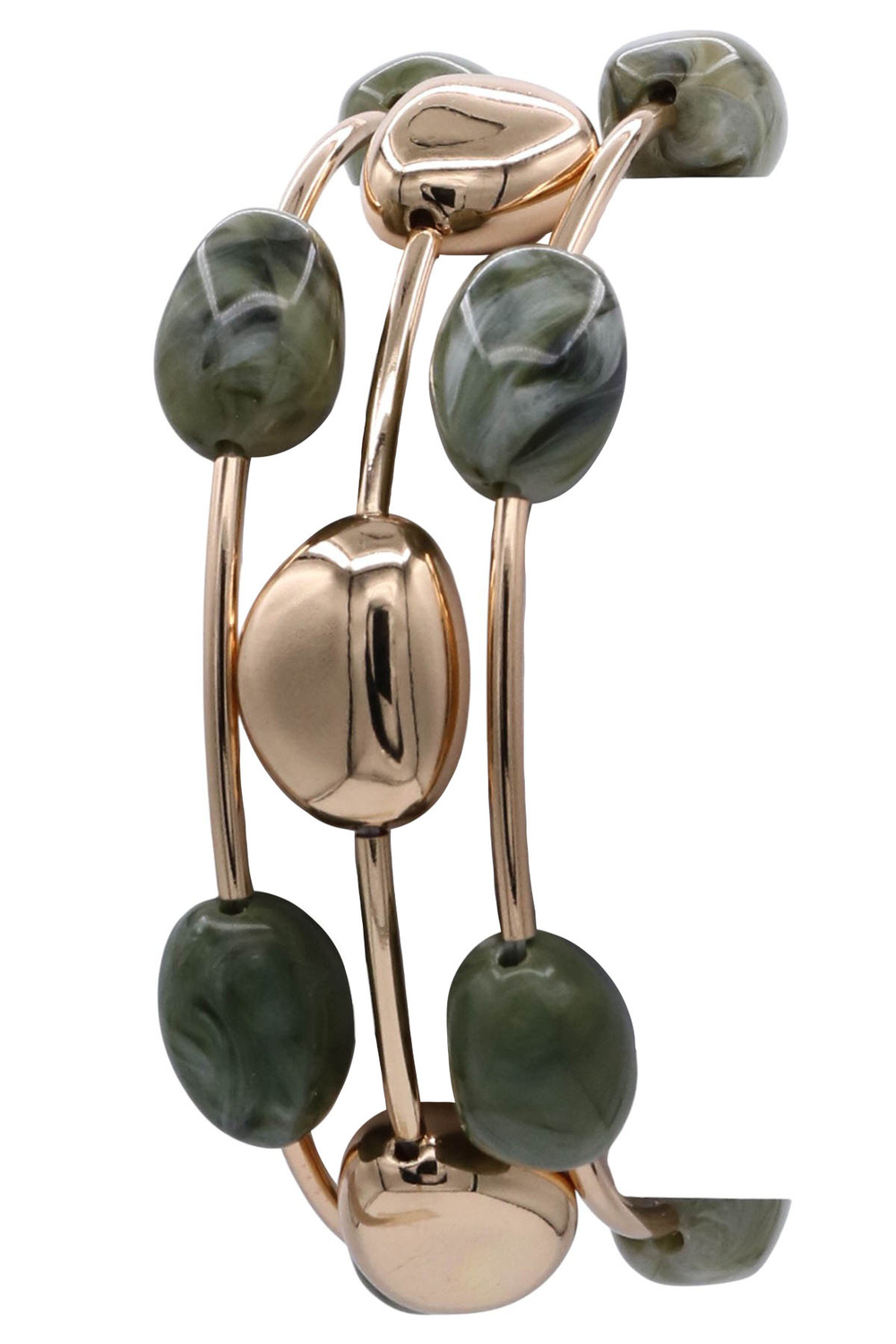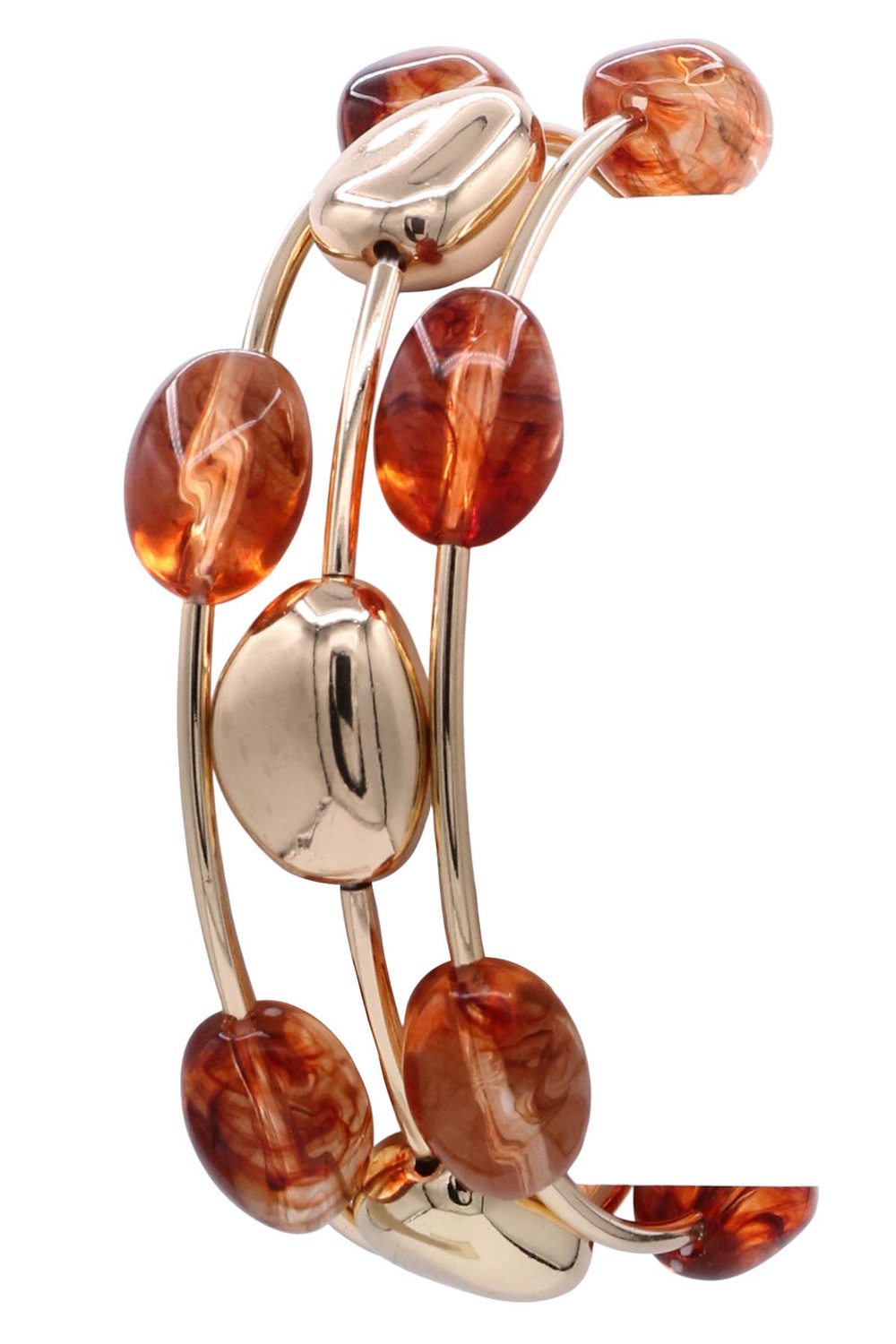 - Elegant multi-bracelet set combining shiny metal tones and colorful acrylic beads.