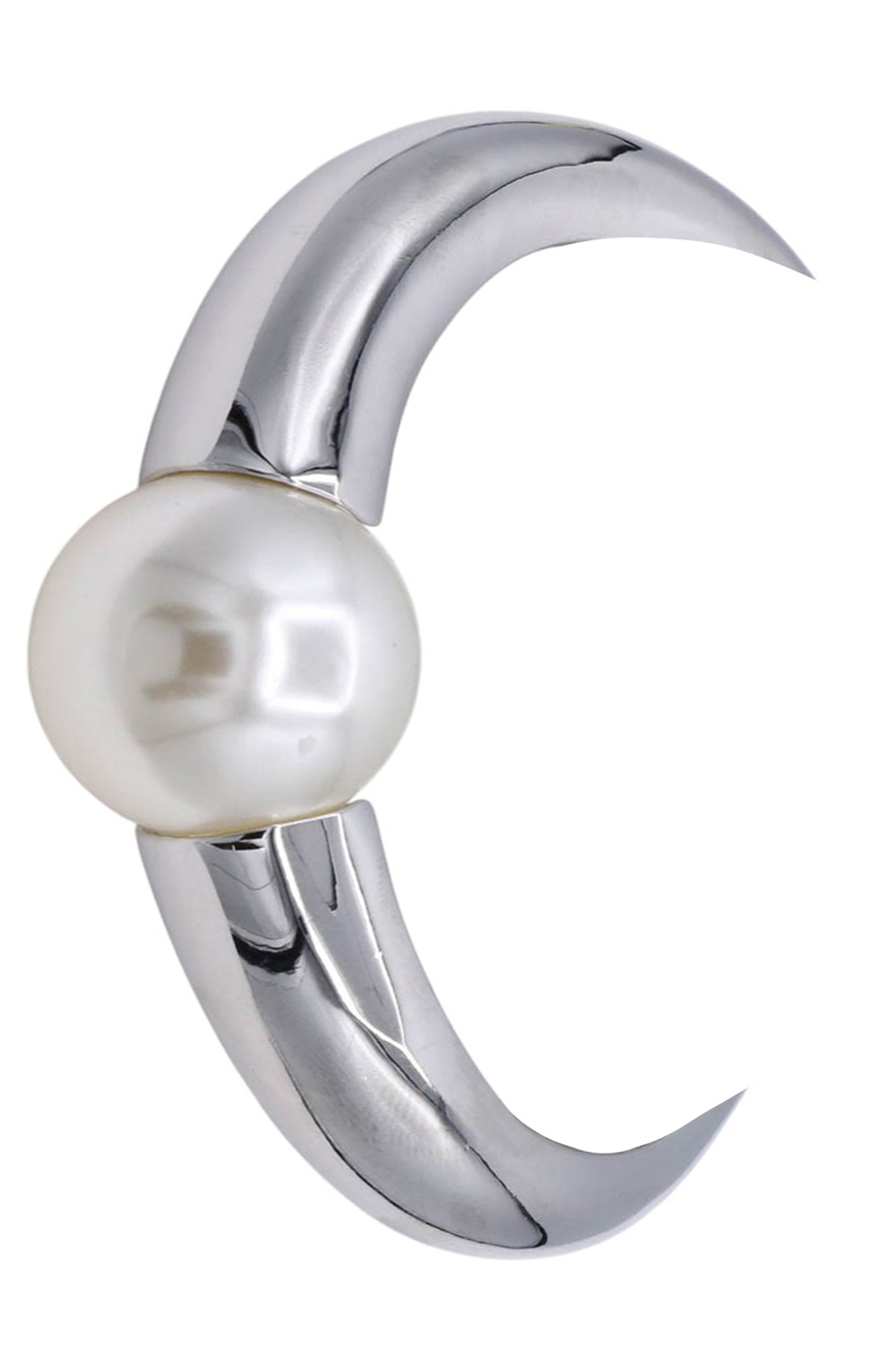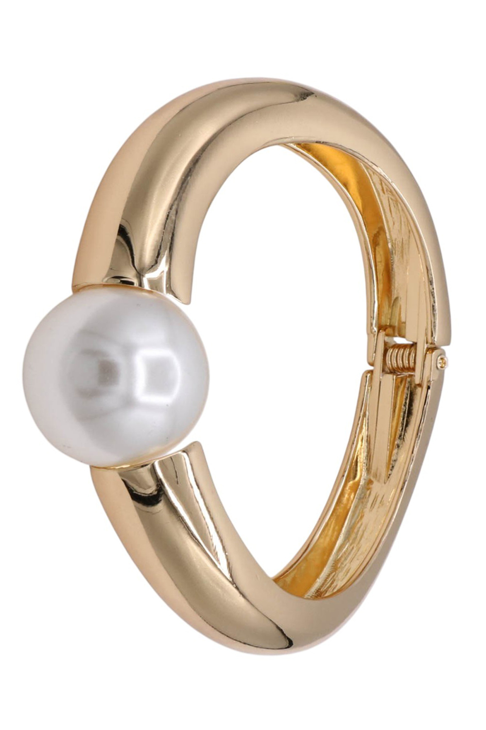 - A stylish bangle bracelet featuring faceted metal details accented with a classic pearl centerpiece. Designed with a hinge closure for easy wear, this elegant piece adds texture and sophistication to any look.