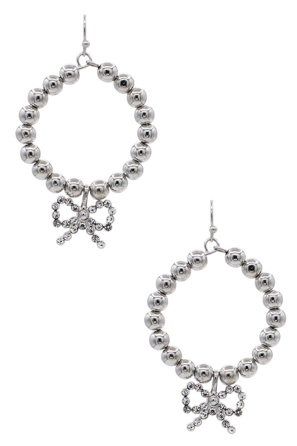 - Charming hoop earrings featuring beads arranged in a classic hoop shape, finished with a sparkling rhinestone-encrusted bow charm. Feminine and eye-catching, these earrings add a playful yet elegant touch to both everyday and dressy looks.