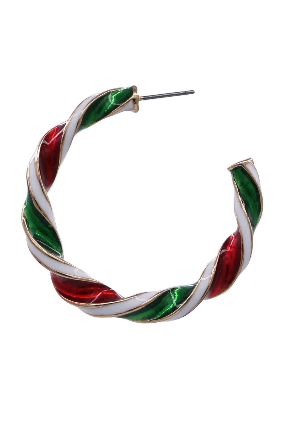 - Holiday-ready twisted hoops decorated with epoxy Christmas details. Perfect for adding sparkle and Christmas charm to any outfit.