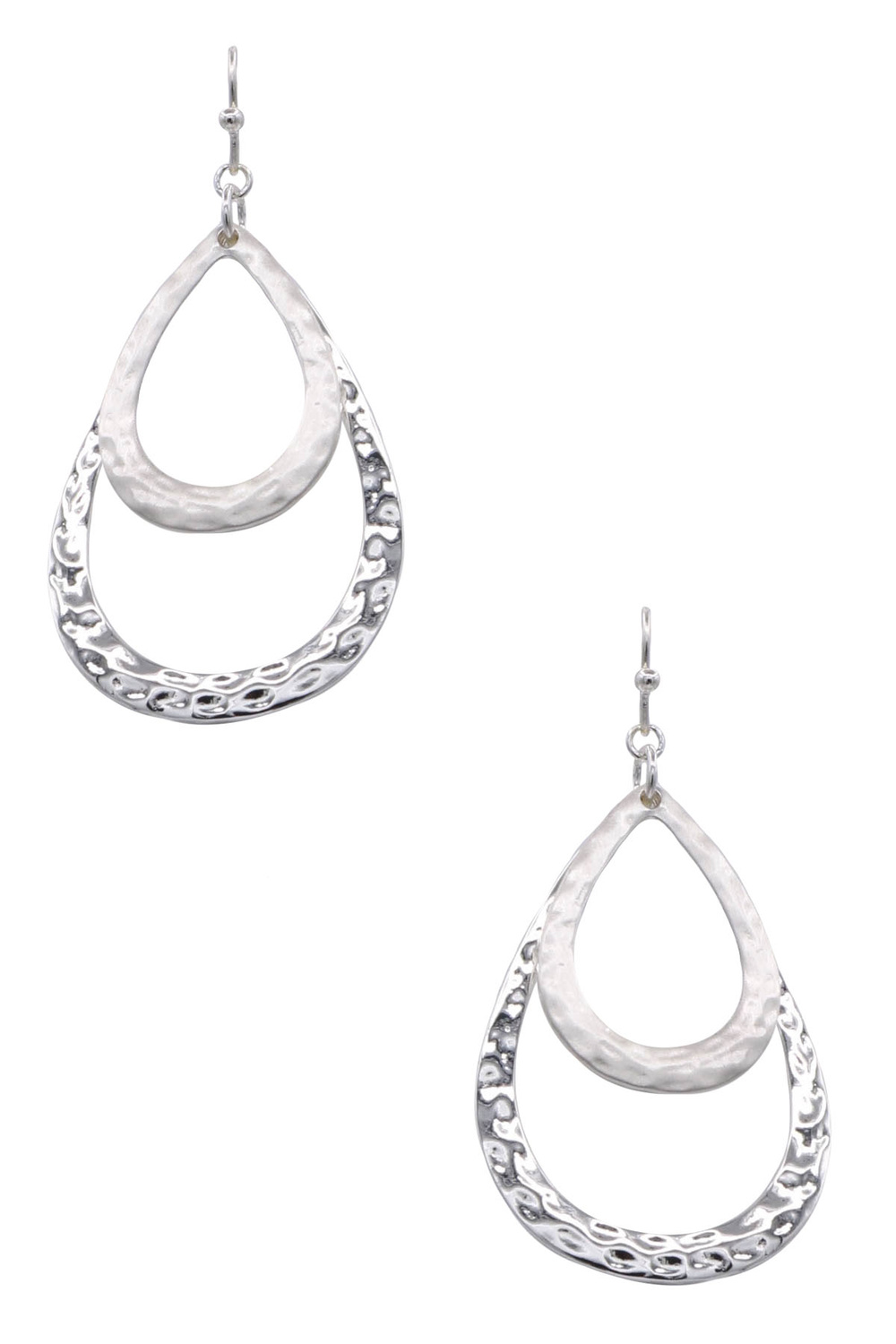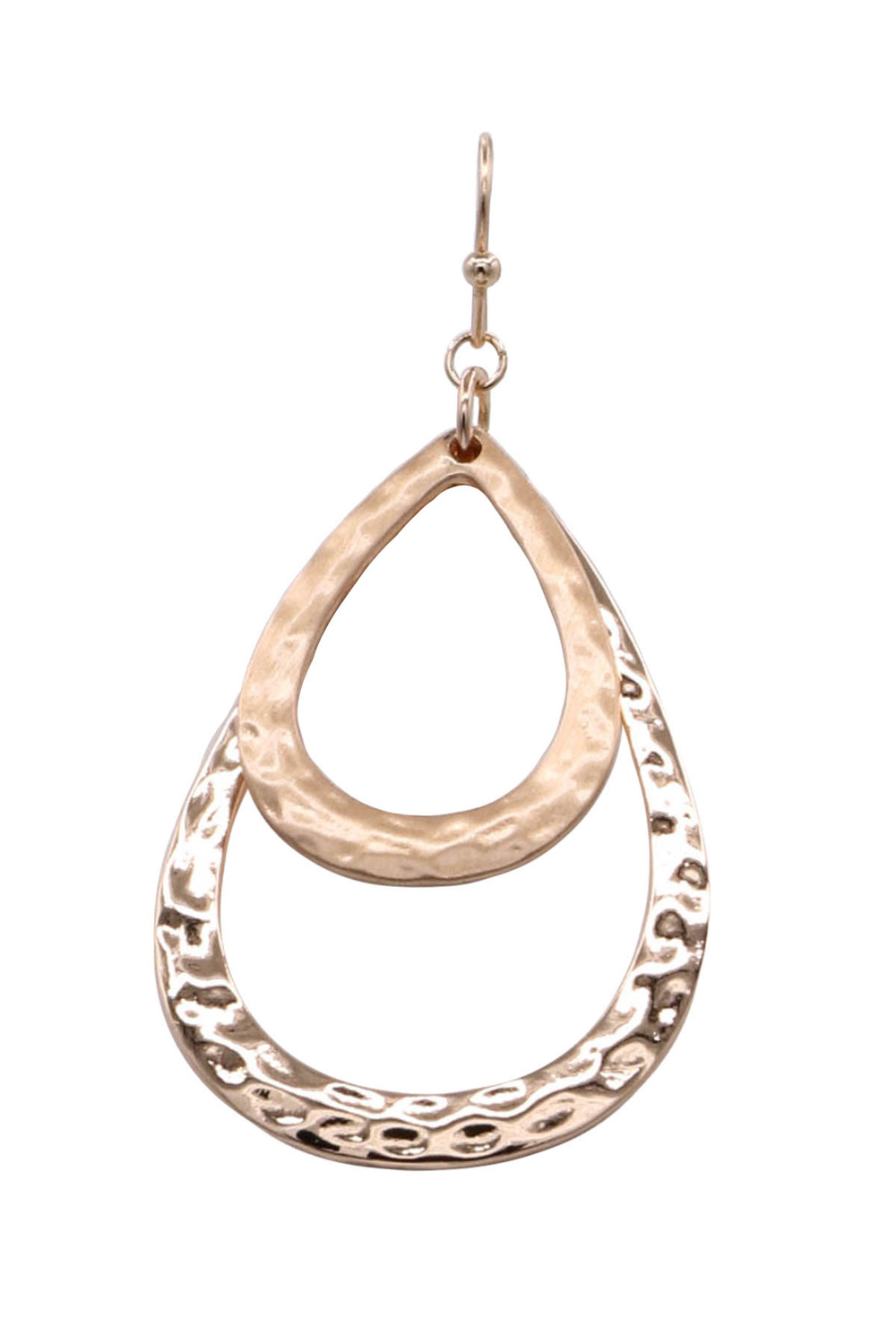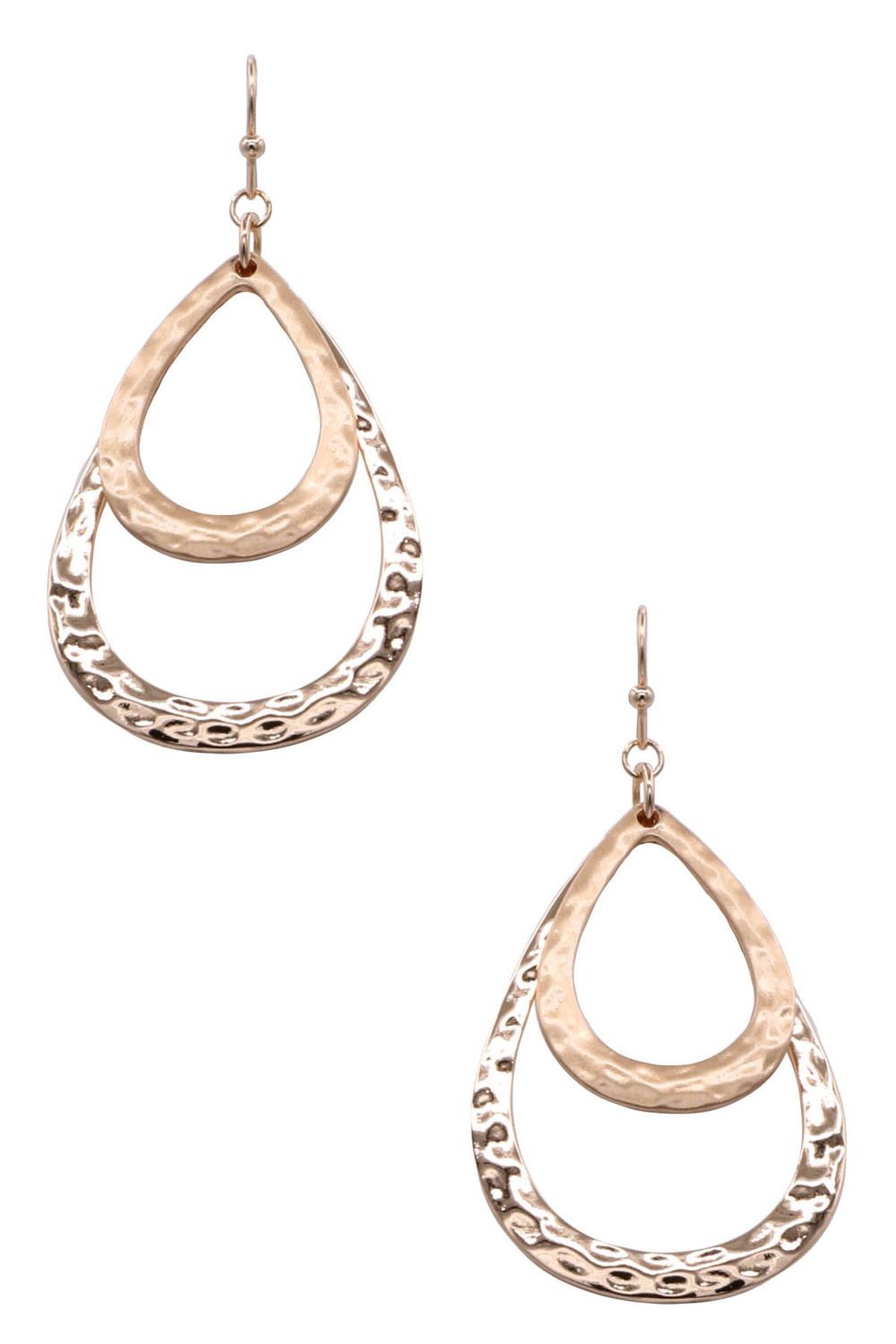 - Elegant dangle earrings featuring a double teardrop design with a hammered texture for added shine and dimension. Lightweight and modern, these earrings bring effortless movement and style to both everyday and dressy looks.