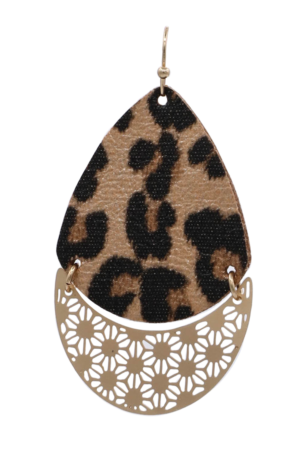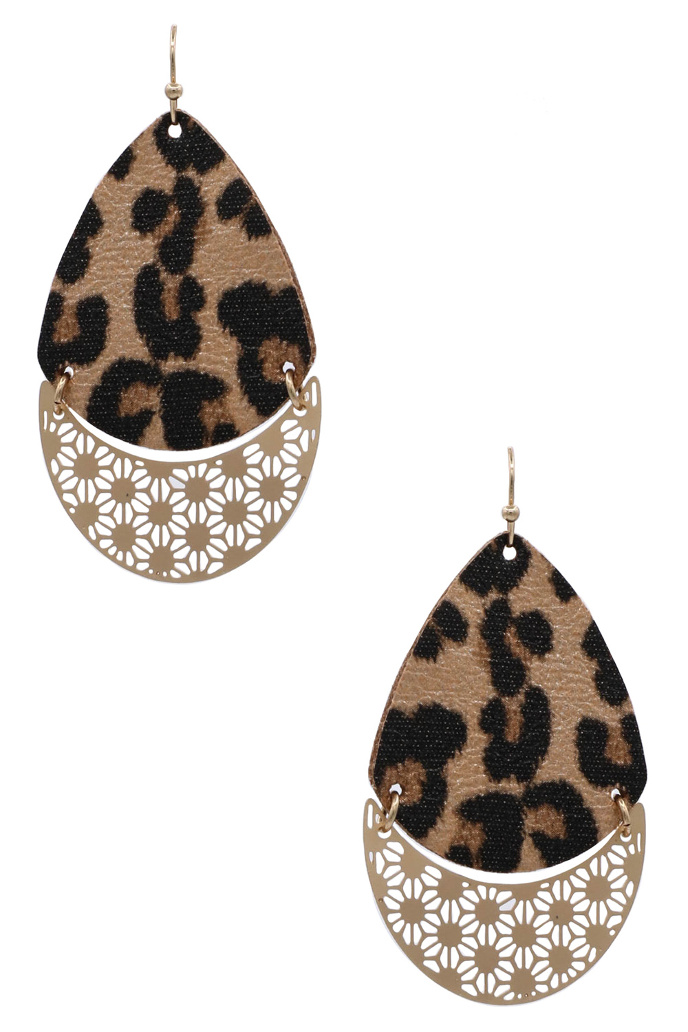 - These stylish drop earrings feature a bold leopard print teardrop shape combined with a delicate, laser-cut floral pattern in a gold tone. The unique design makes a statement while remaining lightweight and comfortable for all-day wear. Perfect for adding a touch of chic bohemian flair to any outfit, these earrings are ideal for both casual and party occasions.
