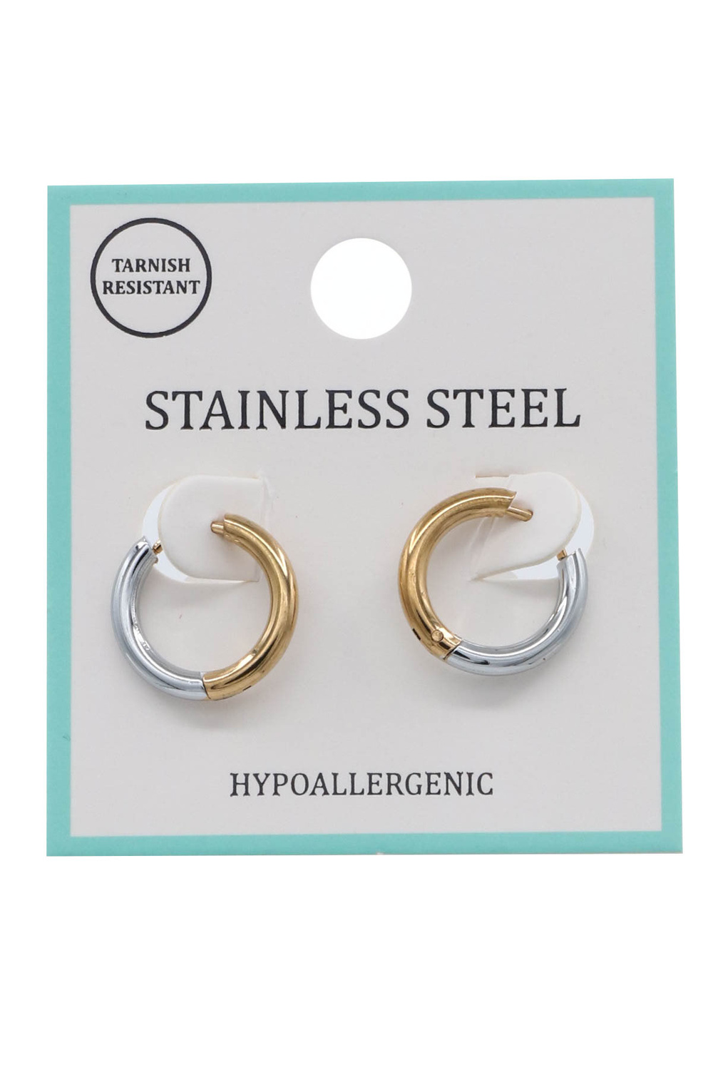 - Polished stainless steel earrings with a dual-tone design for timeless appeal. Comfortable, durable, and perfect for any occasion.