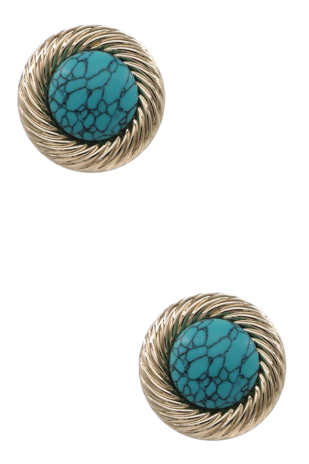 - Round earrings featuring a twisted metal design with a central turquoise-colored stone. Lightweight and stylish for everyday wear.