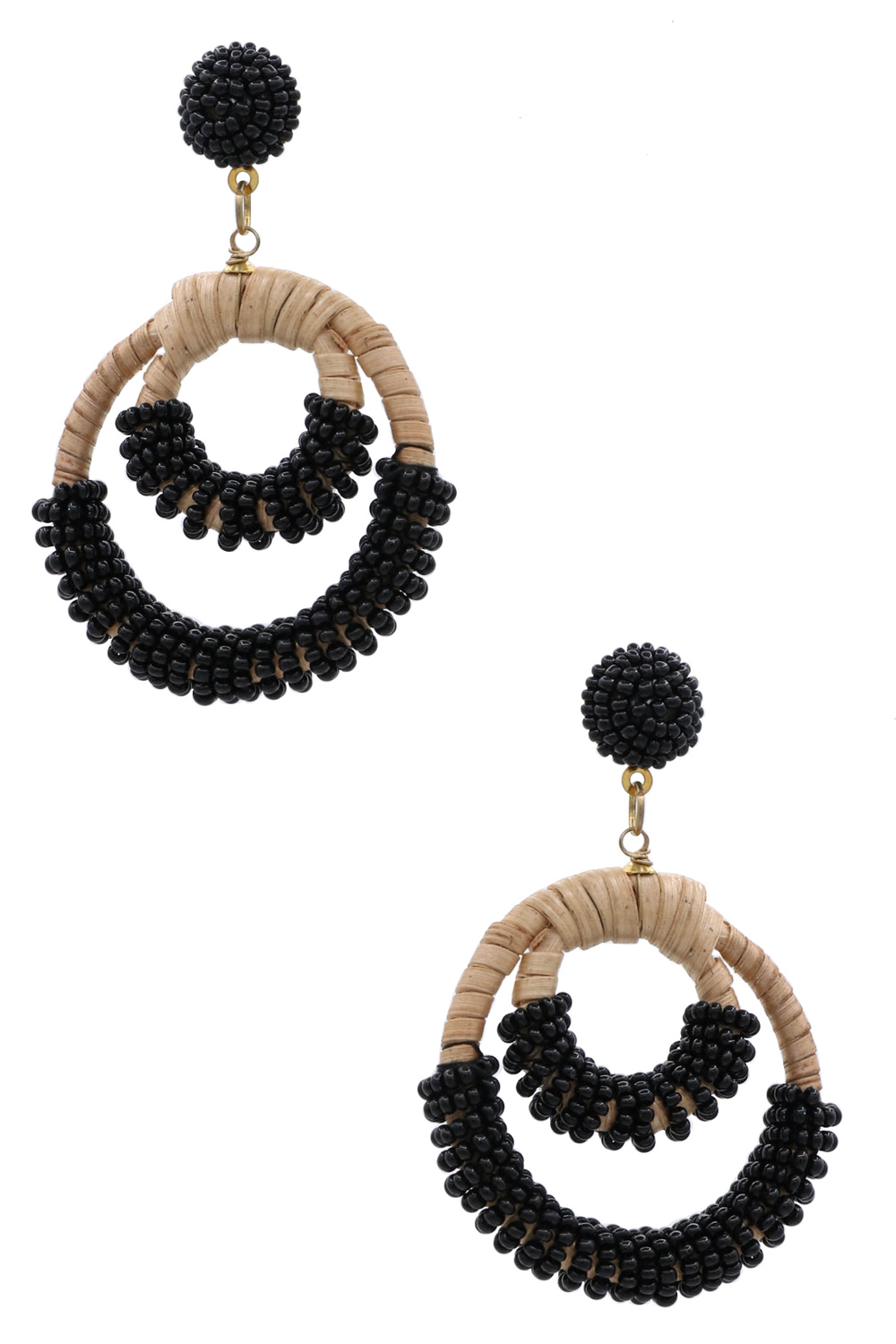 - These stunning drop earrings are the perfect statement piece for any bohemian-inspired outfit. The earrings feature a unique design with a woven raffia circle and beaded ivory accents. These earrings are a true work of art and are sure to become a cherished piece in your jewelry collection. With their versatile design and timeless appeal, these earrings are sure to be a favorite for years to come.