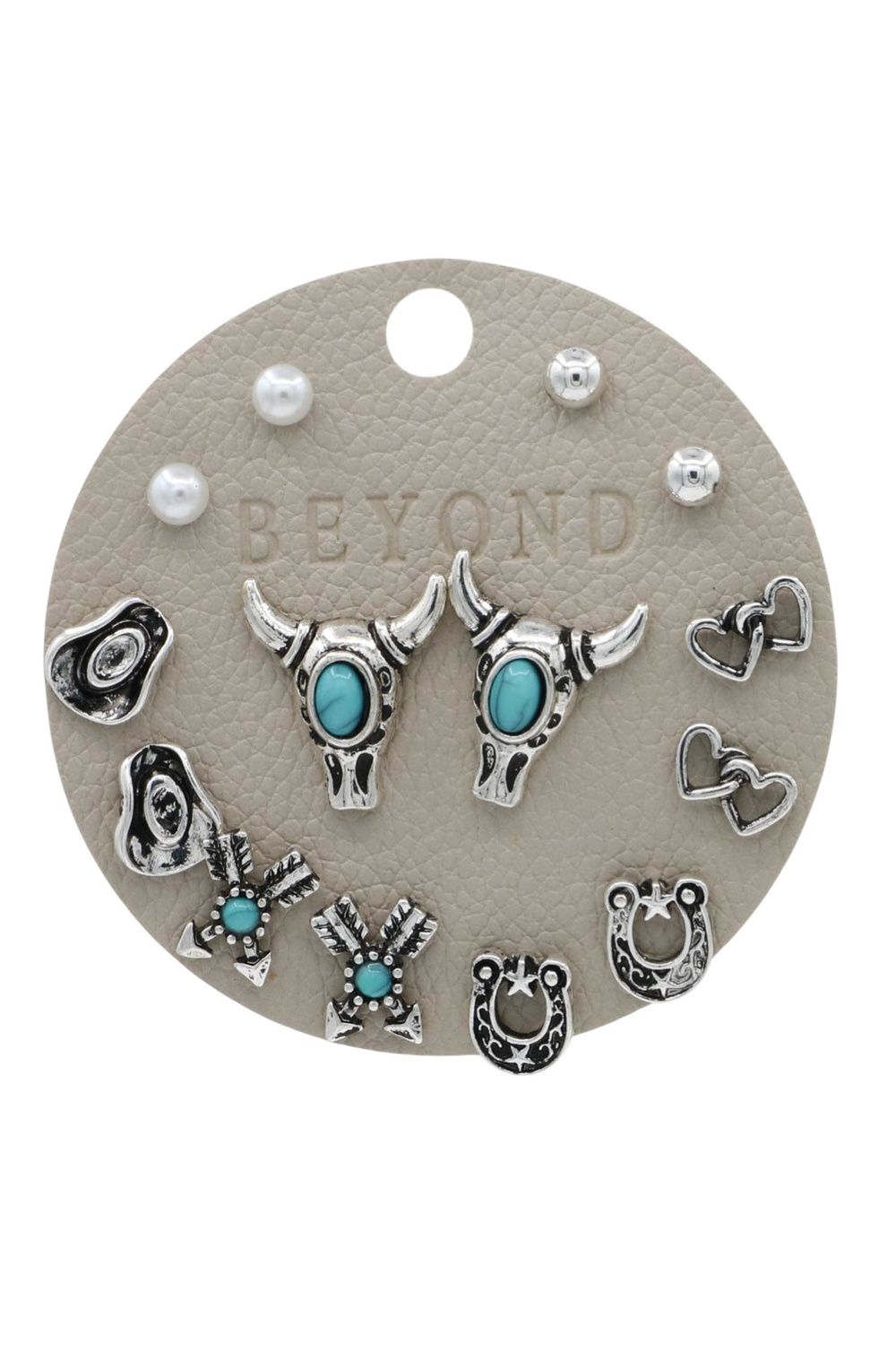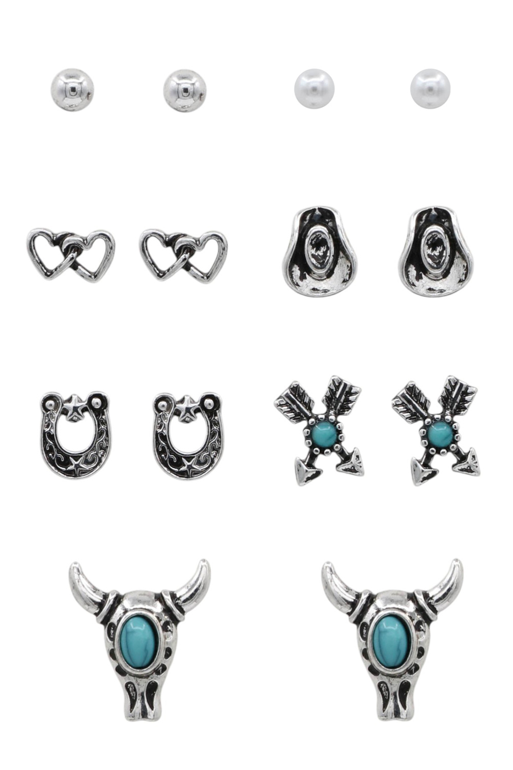 - Bold and playful, this 7-pair western earring set showcases classic cowboy-inspired charms like bull skulls, hats, and horseshoes accented with simulated turquoise stones. Perfect for everyday western styling or gifting.