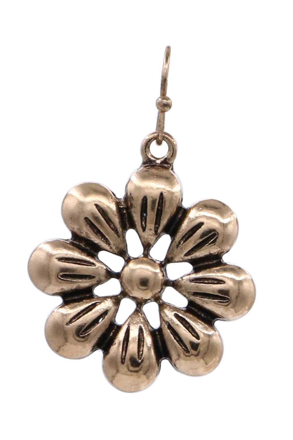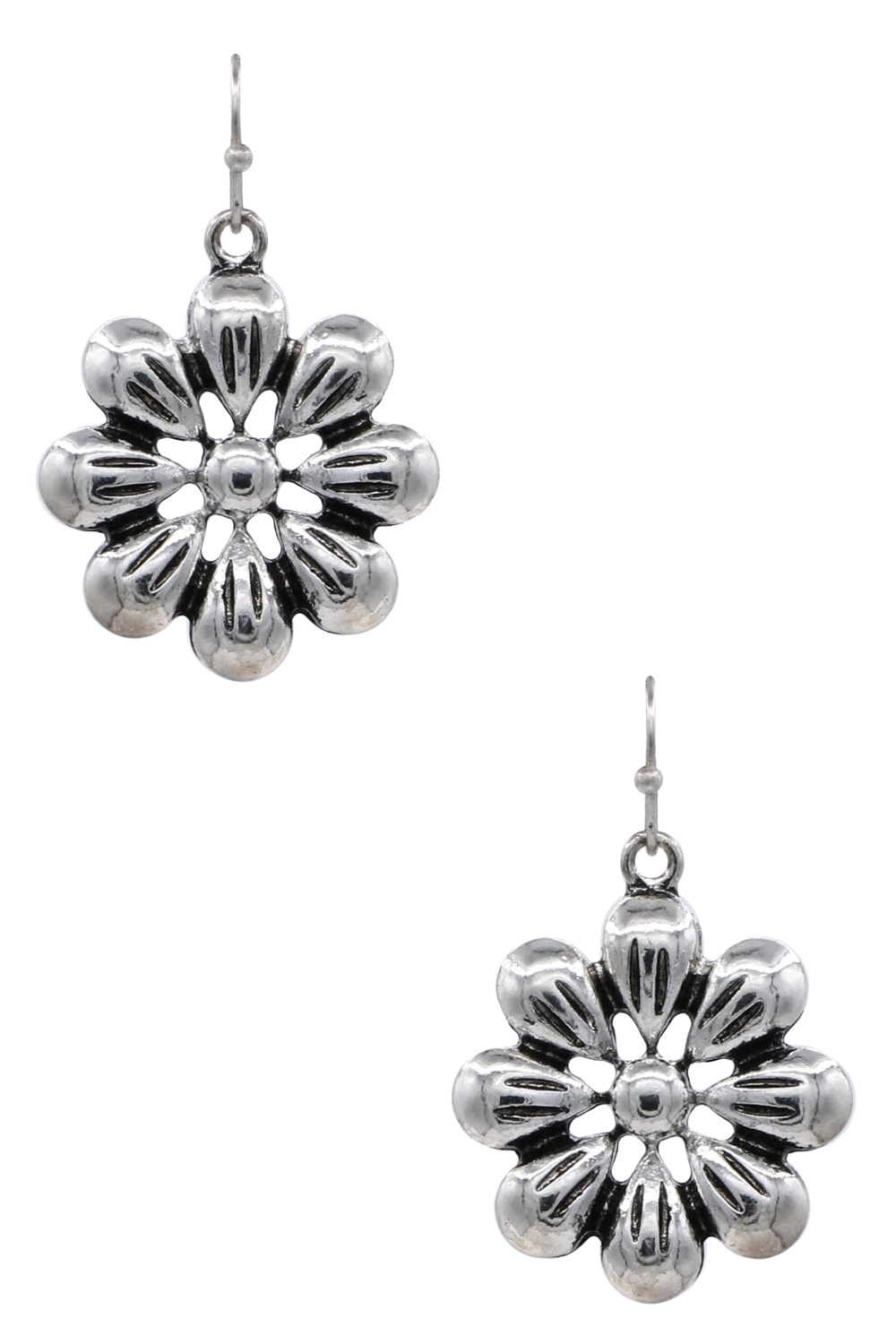 - Flower drop earrings crafted in an antiqued metal finish for a classic vintage look. Lightweight and easy to wear.
