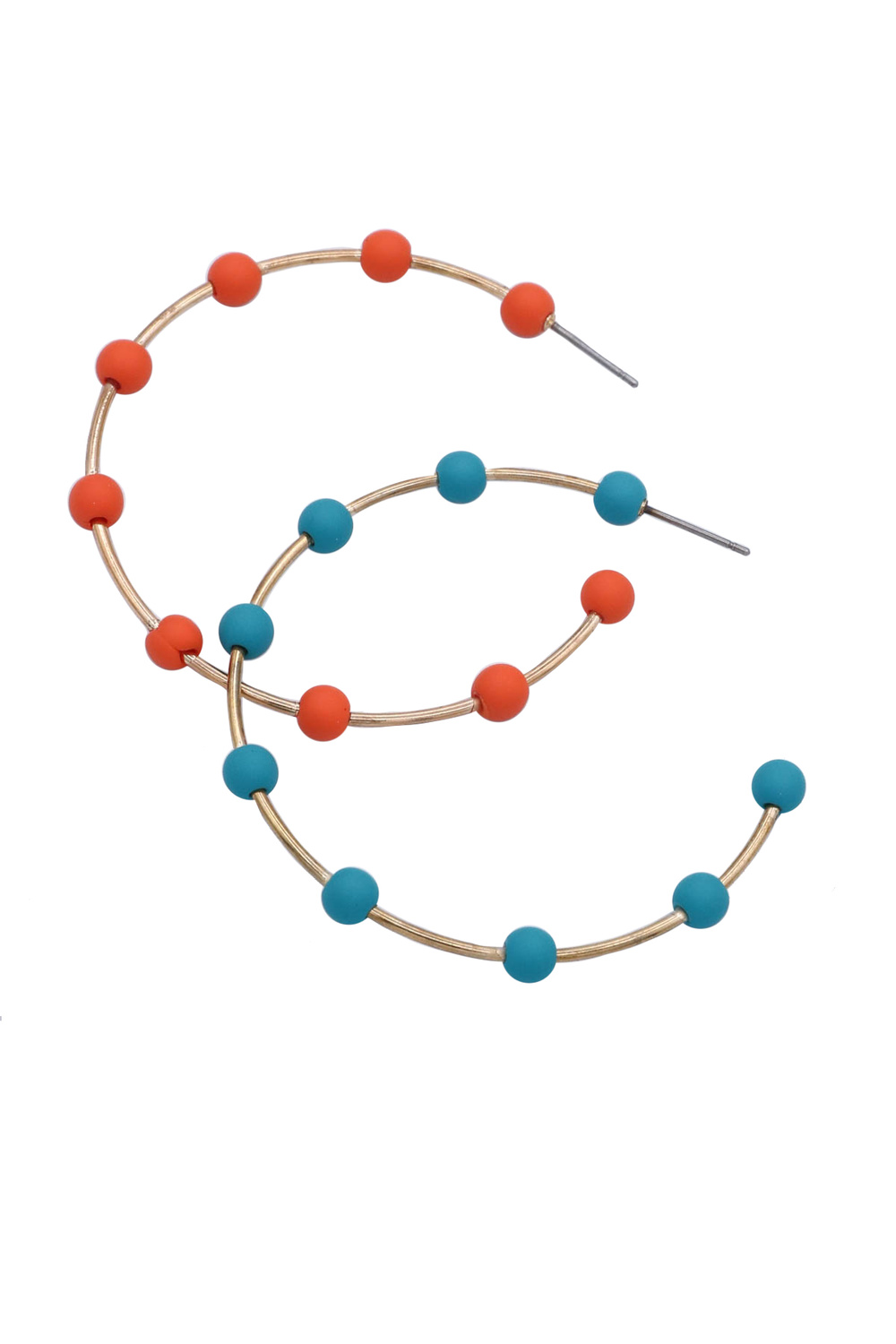 - These exquisite gold-tone hoop earrings are adorned with a captivating series of turquoise and orange beads, creating a vibrant and eye-catching accessory. The delicate gold hoops provide a classic framework, while the strategically placed beads add a playful pop of color and a touch of bohemian charm.