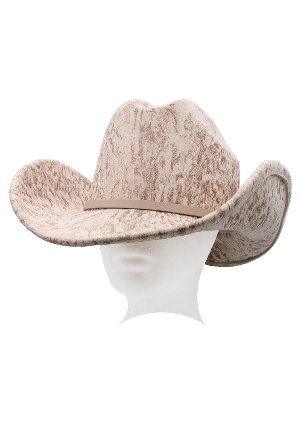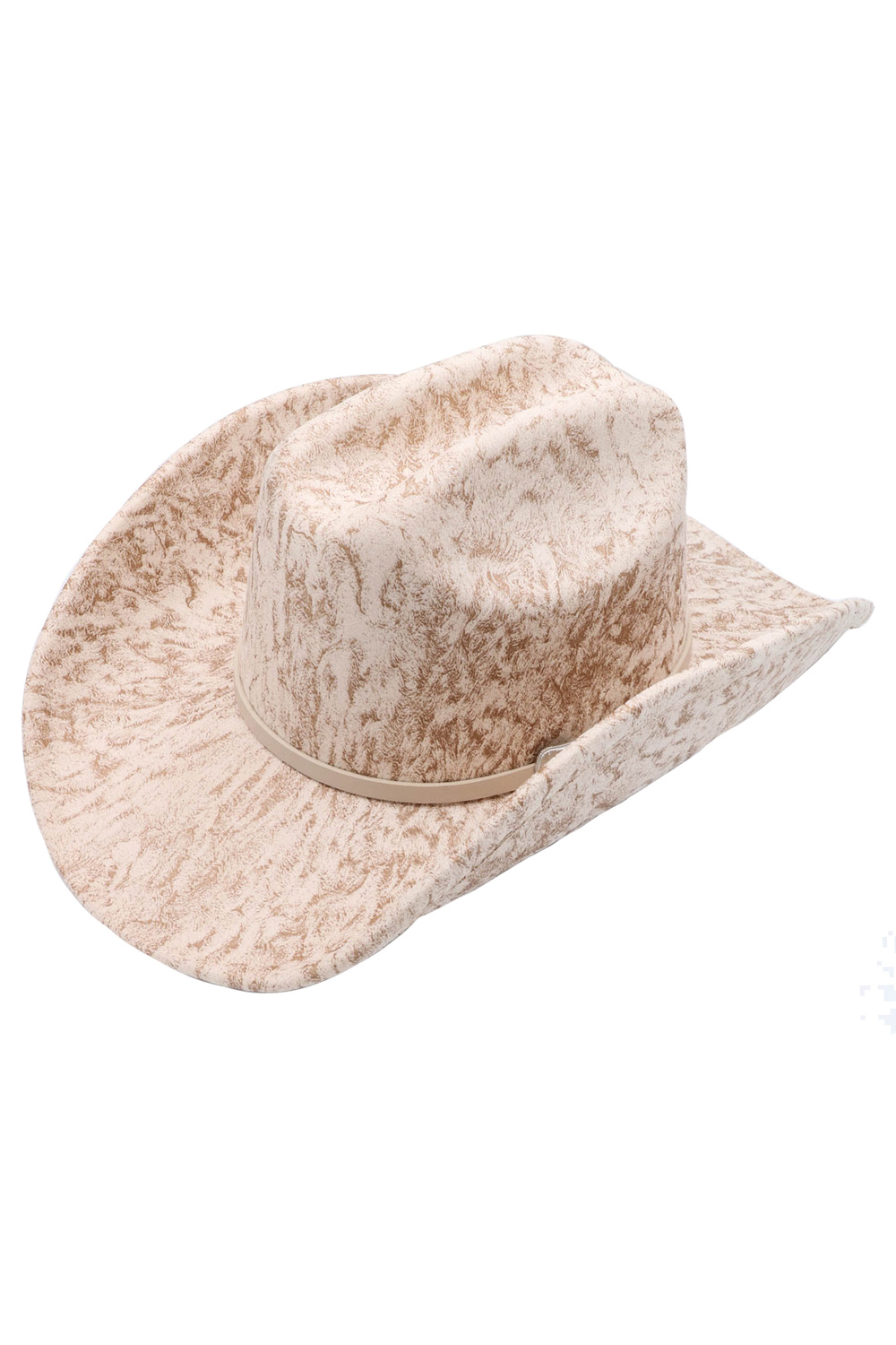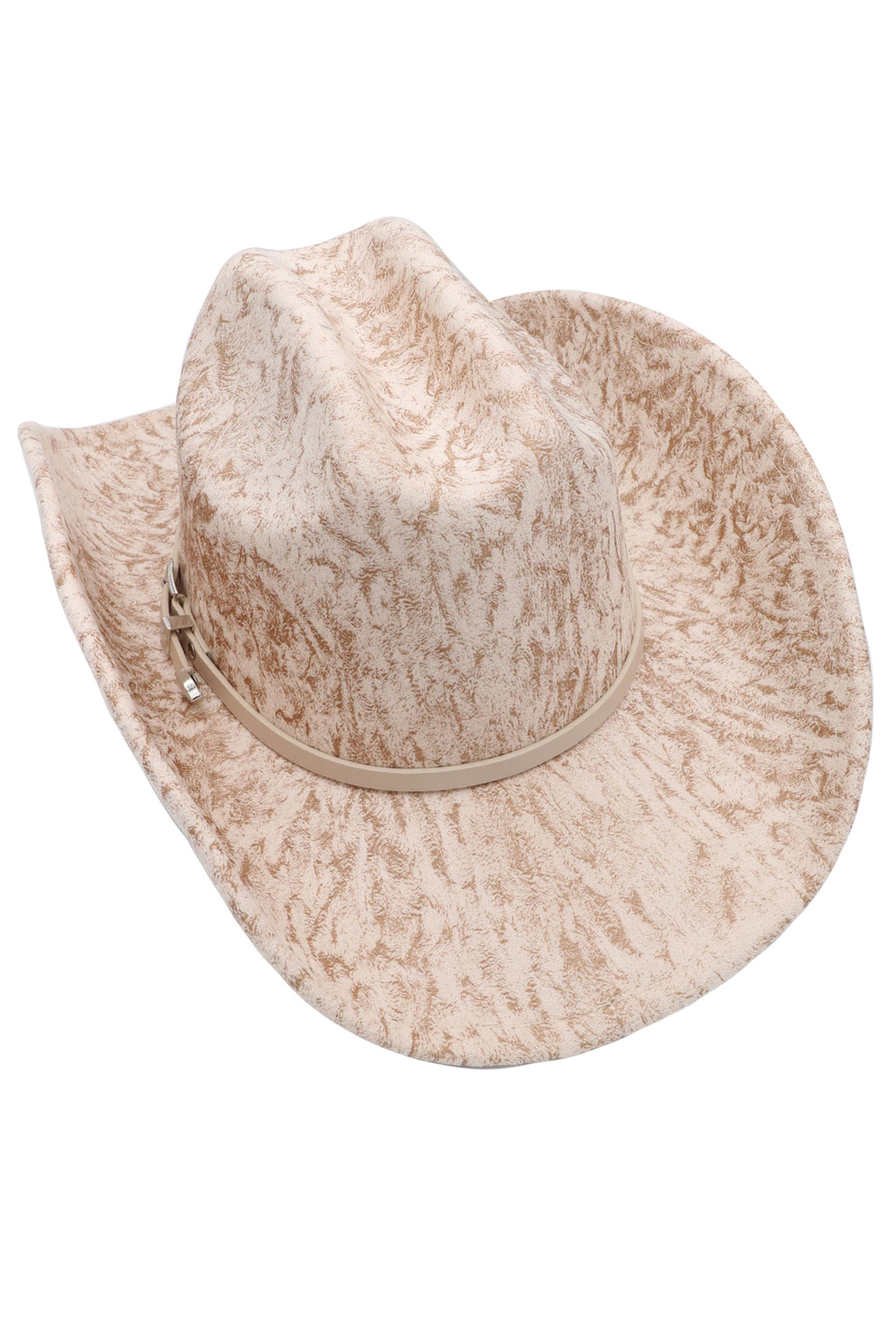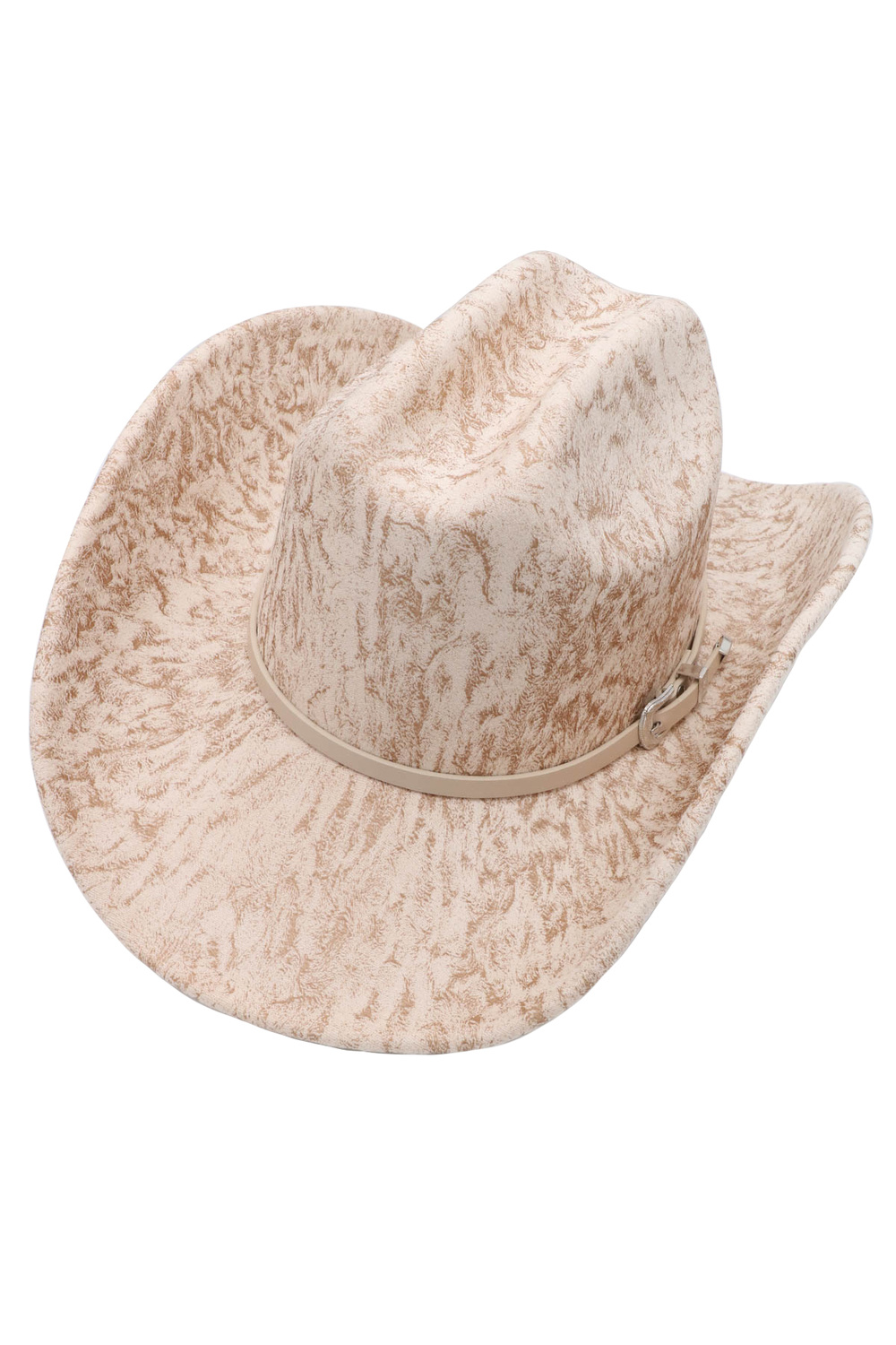 - Vintage-style microsuede cowboy hat with a sand wash finish and buckle-accented band. Perfect for western or casual styling.