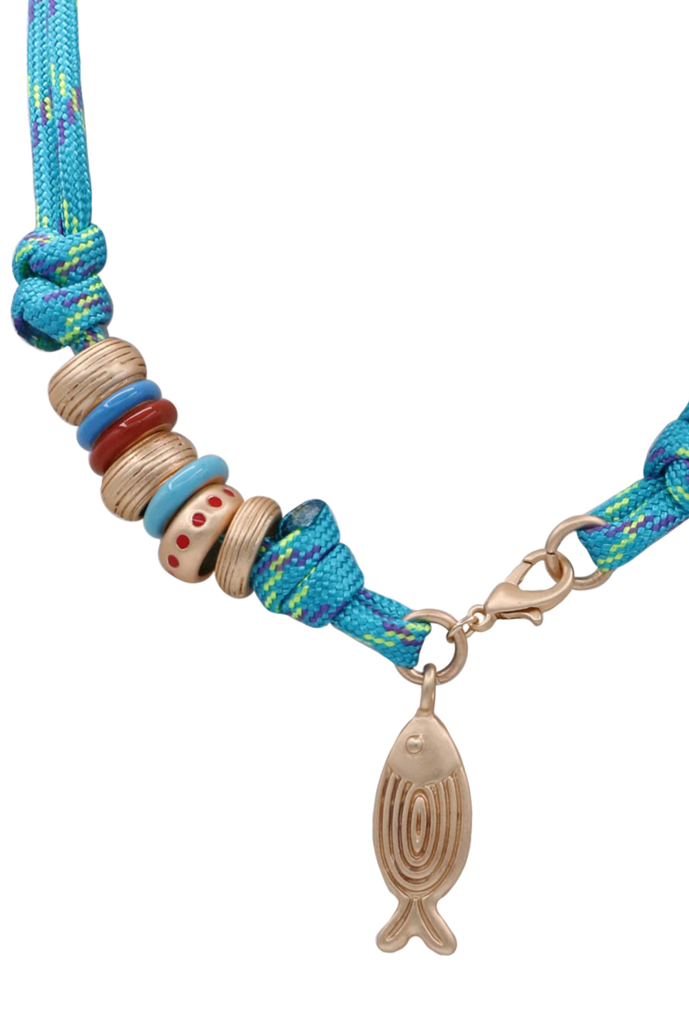 - Knotted cord necklace featuring bead accents and a fish pendant. Lightweight with a casual, laid-back style.