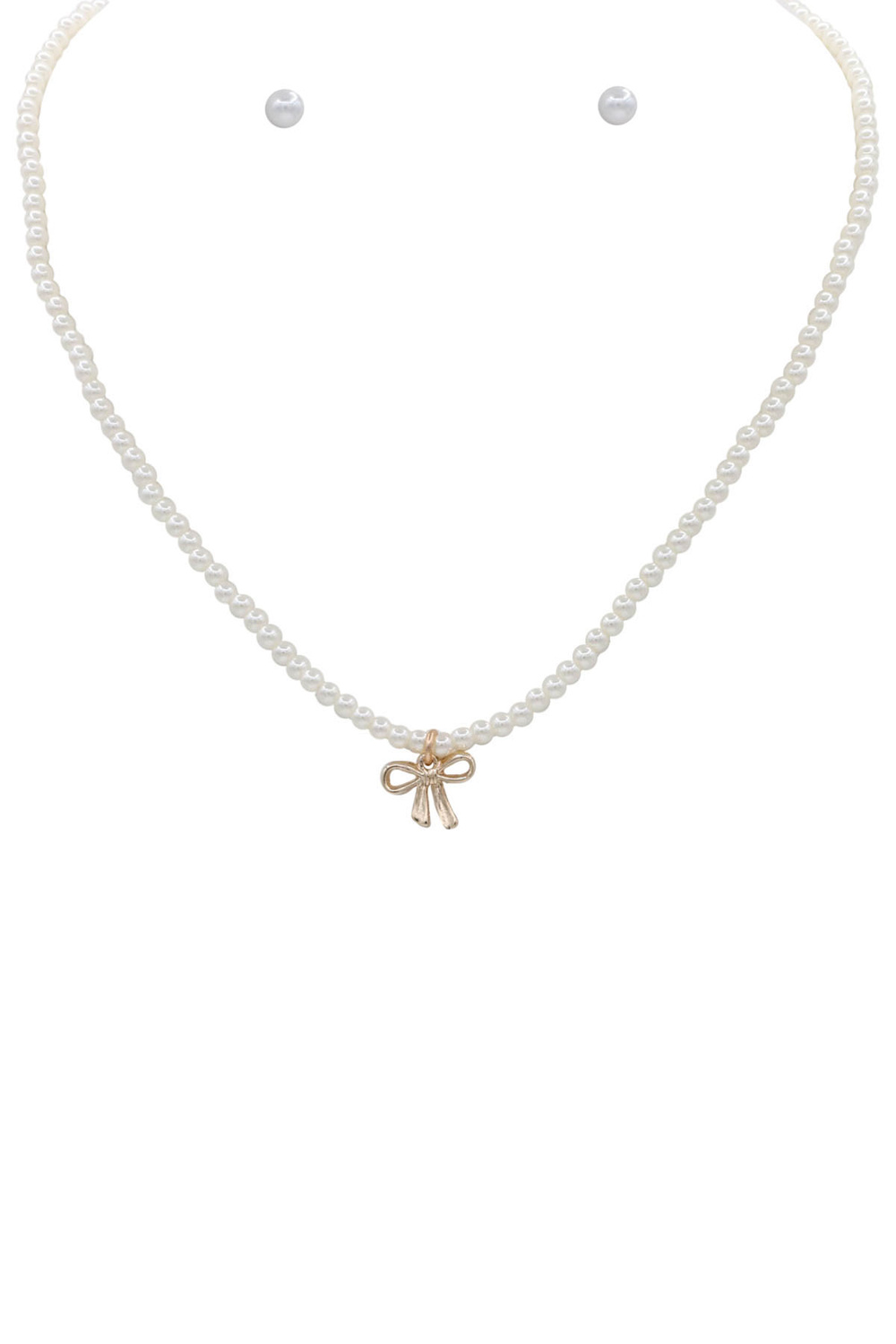 - A delicate cream pearl-beaded necklace featuring a sweet bow tie pendant for a soft, feminine touch.