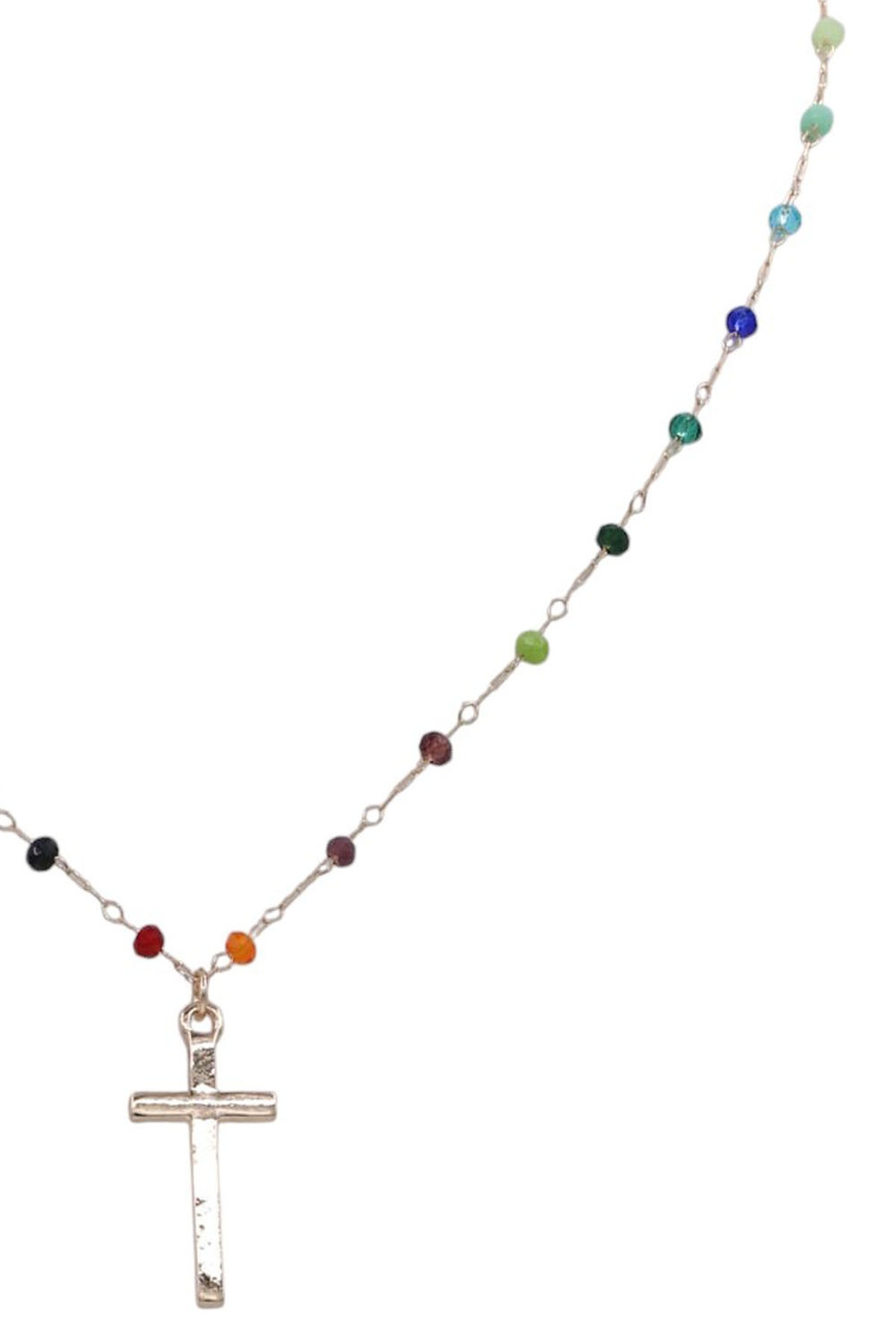 - A beautiful glass beaded necklace featuring a delicate cross pendant. Adds a touch of sparkle and grace to any outfit.