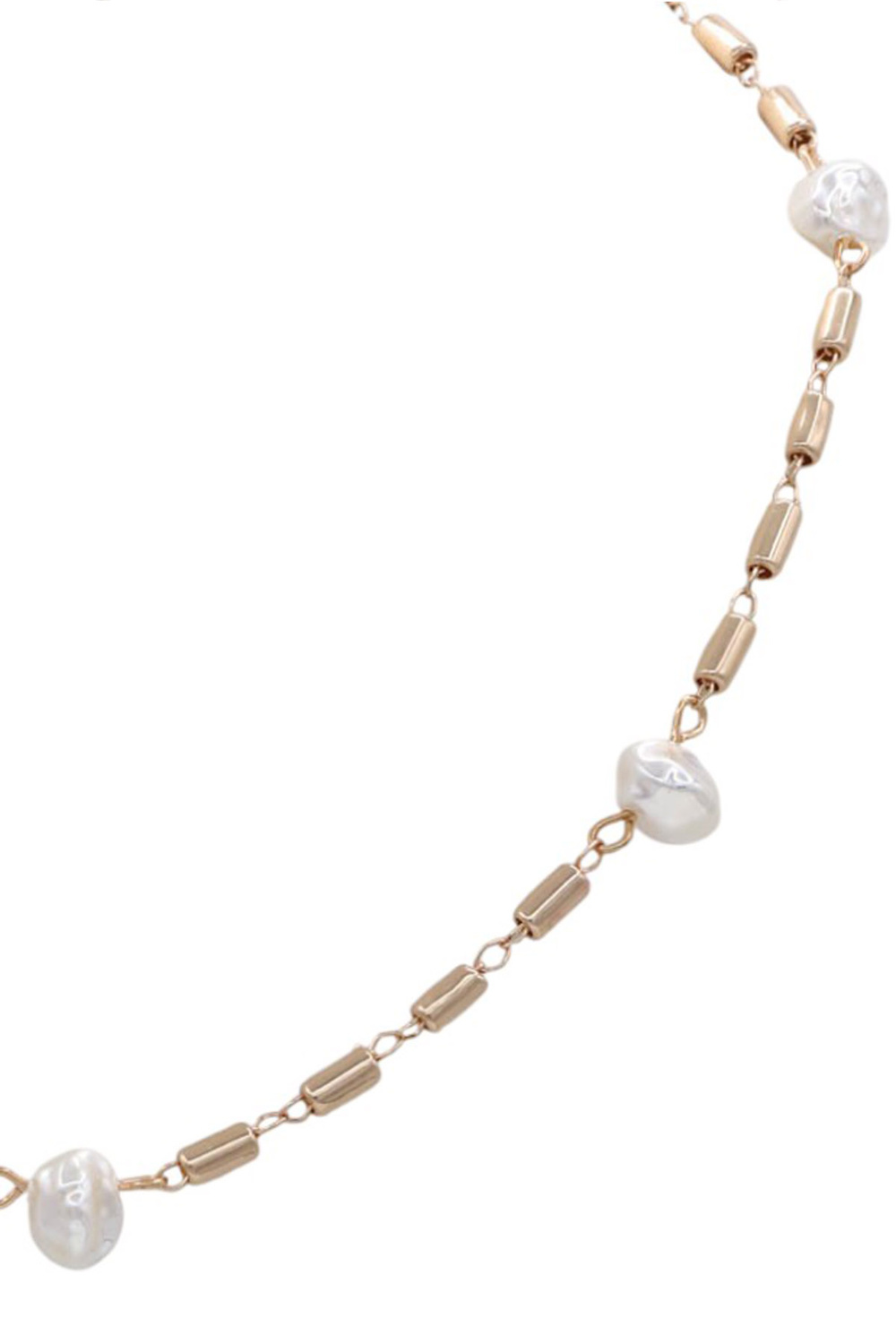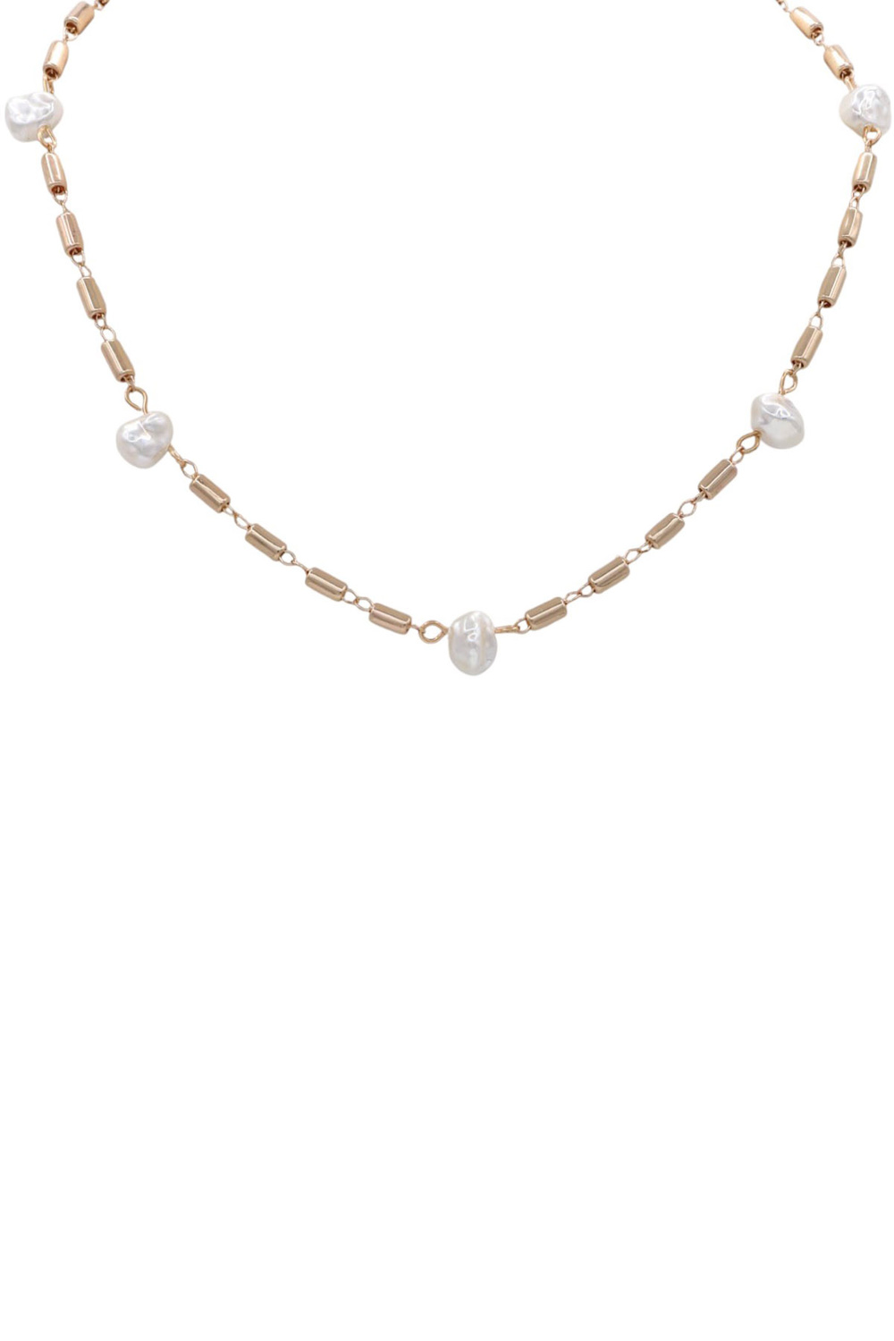 - Chic and feminine, this metal linked necklace showcases a smooth cream pearl and a bar detail that adds timeless elegance to any outfit. Perfect for layering or wearing solo.