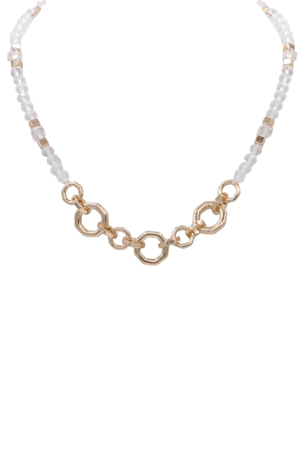 - This exquisite necklace is a harmonious blend of delicate crystal beads and bold gold-tone geometric links, creating a captivating piece that exudes modern elegance. The strand of clear, faceted crystal beads catches the light with every movement, adding a subtle sparkle and a touch of ethereal beauty.Its ability to transition from casual daytime chic to sophisticated evening wear makes it a truly indispensable fashion accessory. The interplay of textures and shapes offers a unique tactile and visual experience, embodying a sense of modern artistry in jewelry.