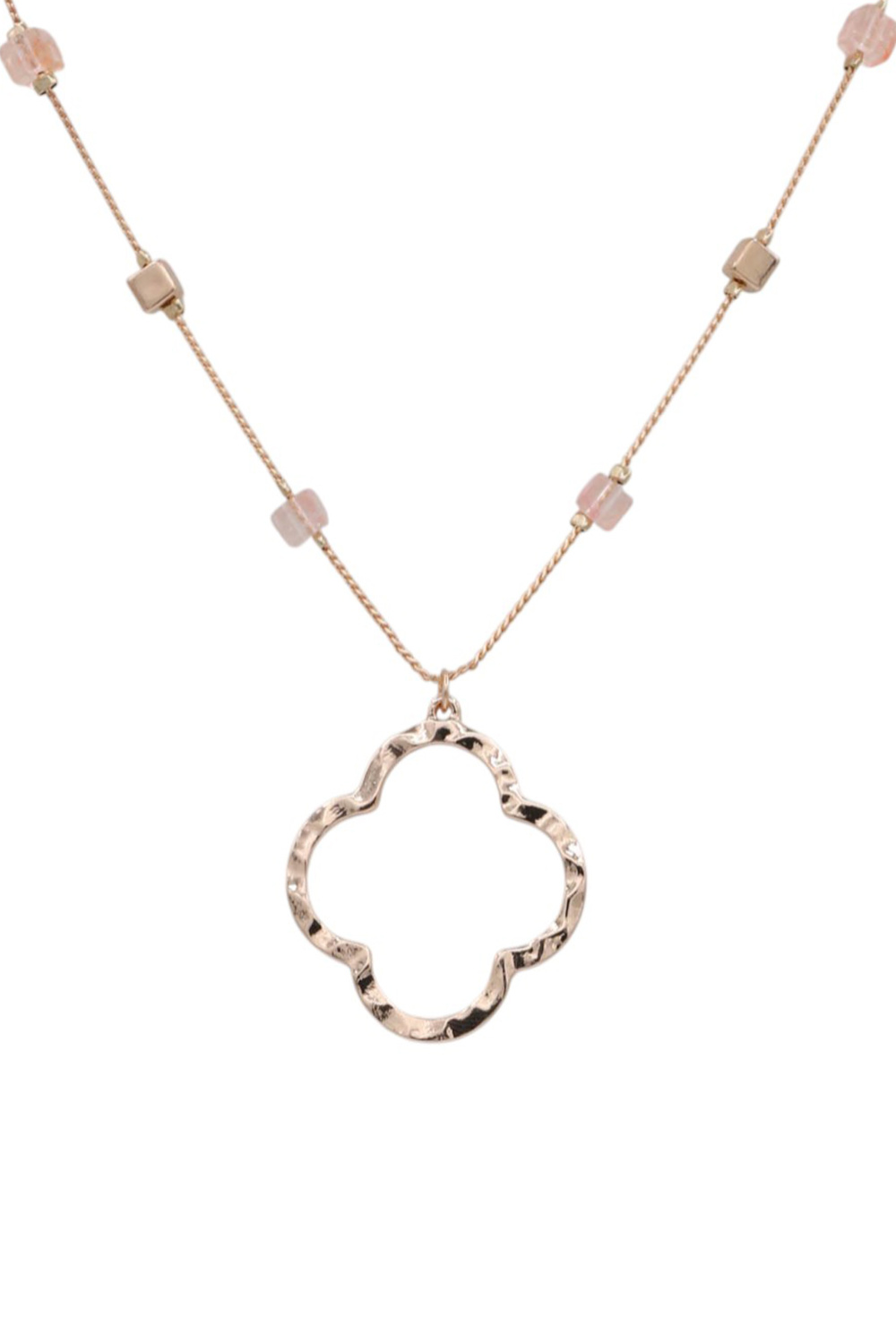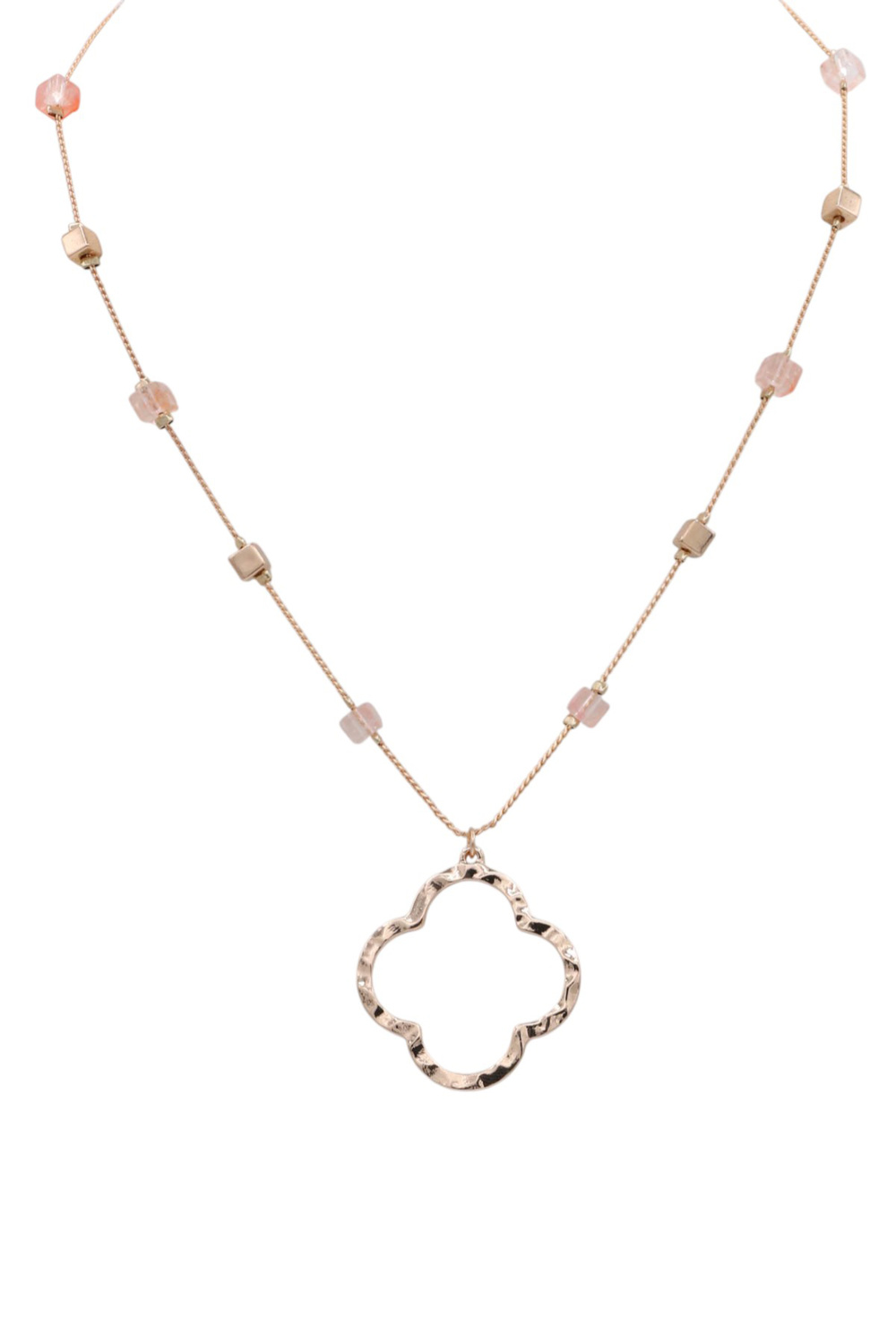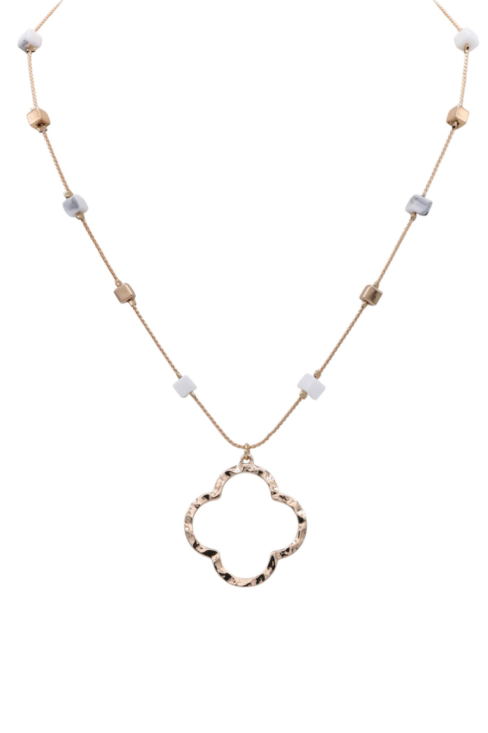- This exquisite gold-tone necklace features a delicate chain adorned with a charming clover-shaped pendant. The pendant boasts a hammered texture, adding a touch of artisanal appeal and subtle shimmer. It's a piece that transitions effortlessly from day to night, office to occasion, embodying versatility and enduring style.