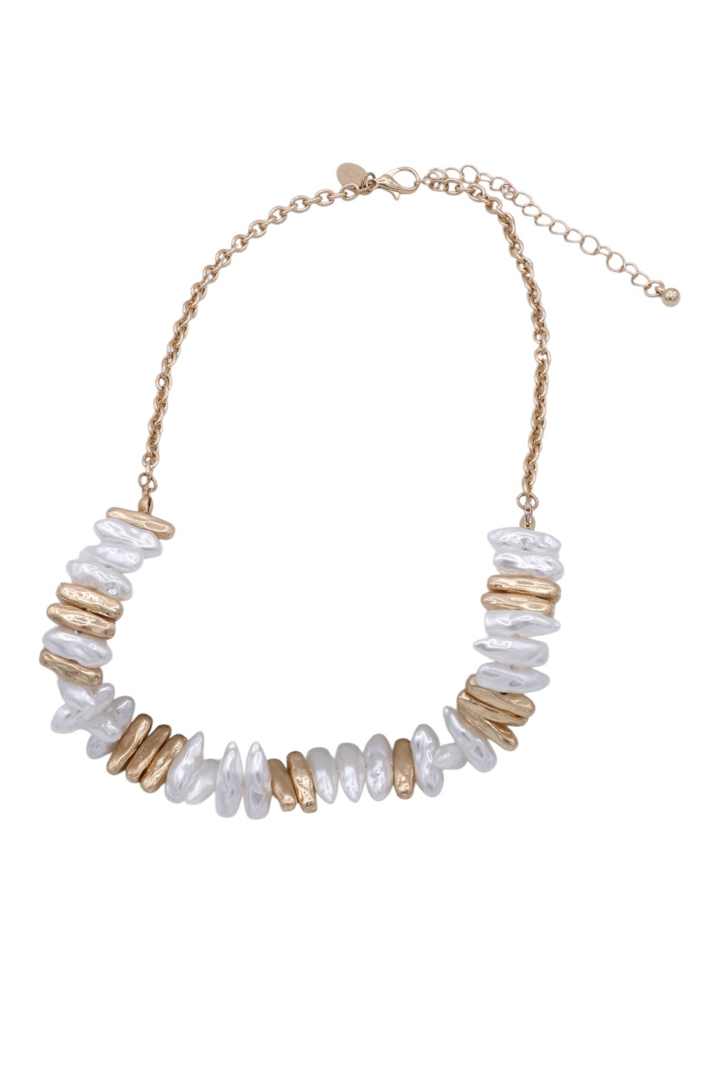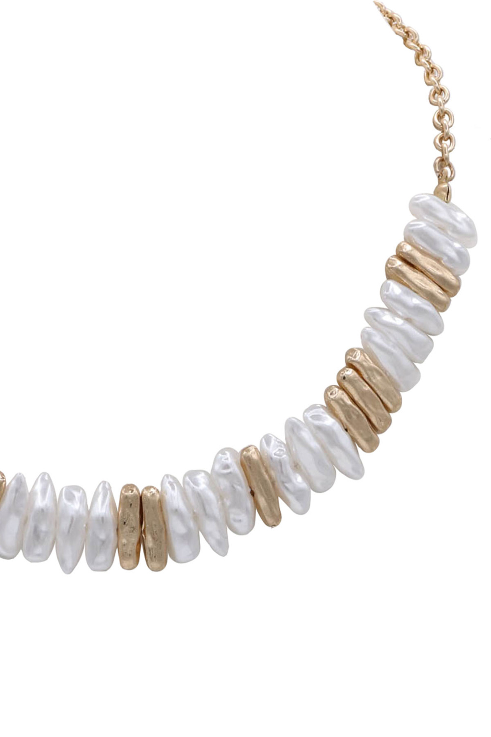- A chic necklace featuring hammered cast metal links accented with classic pearl details for a modern, textured look. Elegant and versatile, this piece adds a refined touch of shine to everyday and dressy outfits.