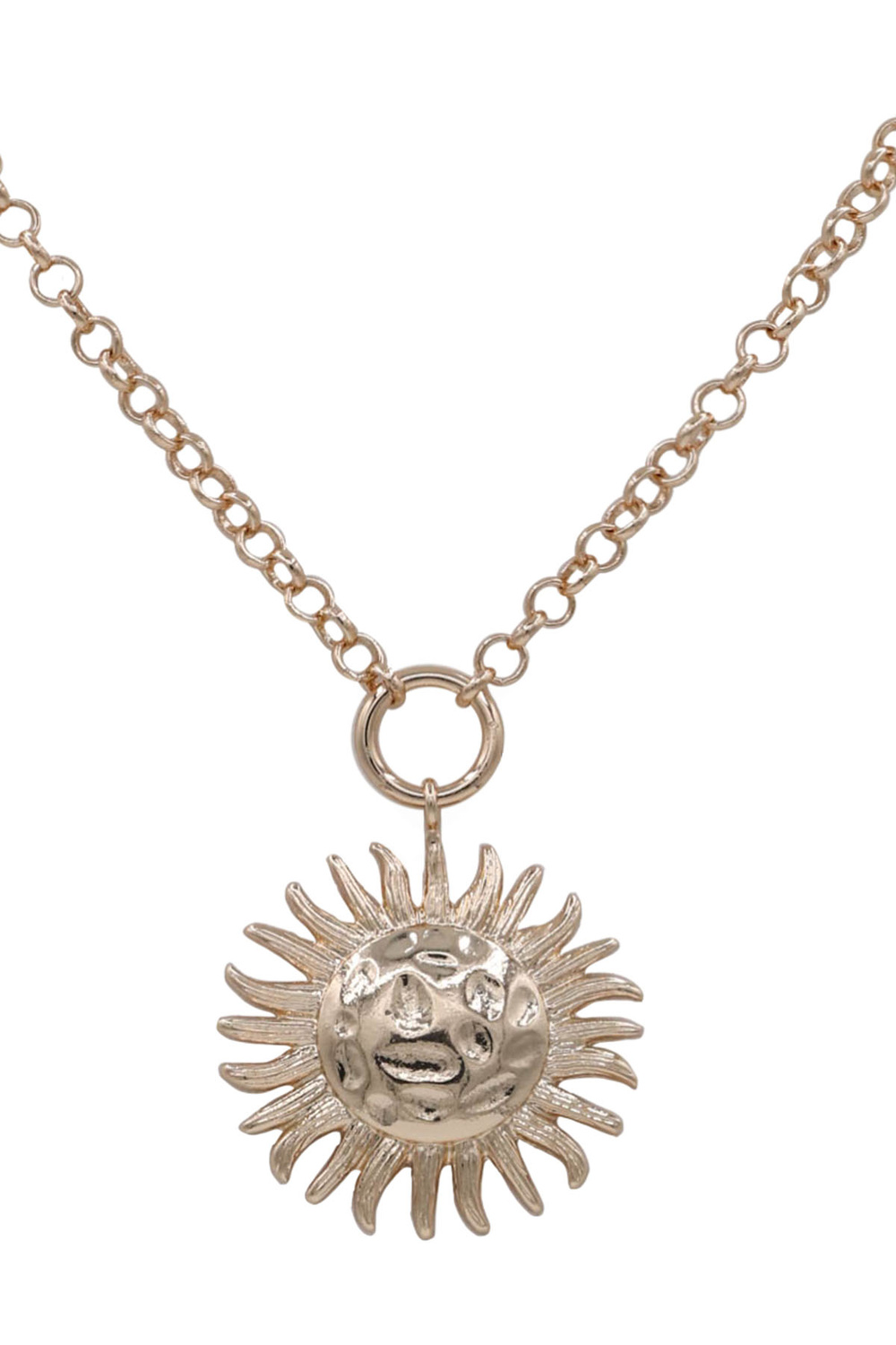 - Metal chain necklace featuring a radiant sun pendant. A stylish piece that adds warmth and charm to any outfit.