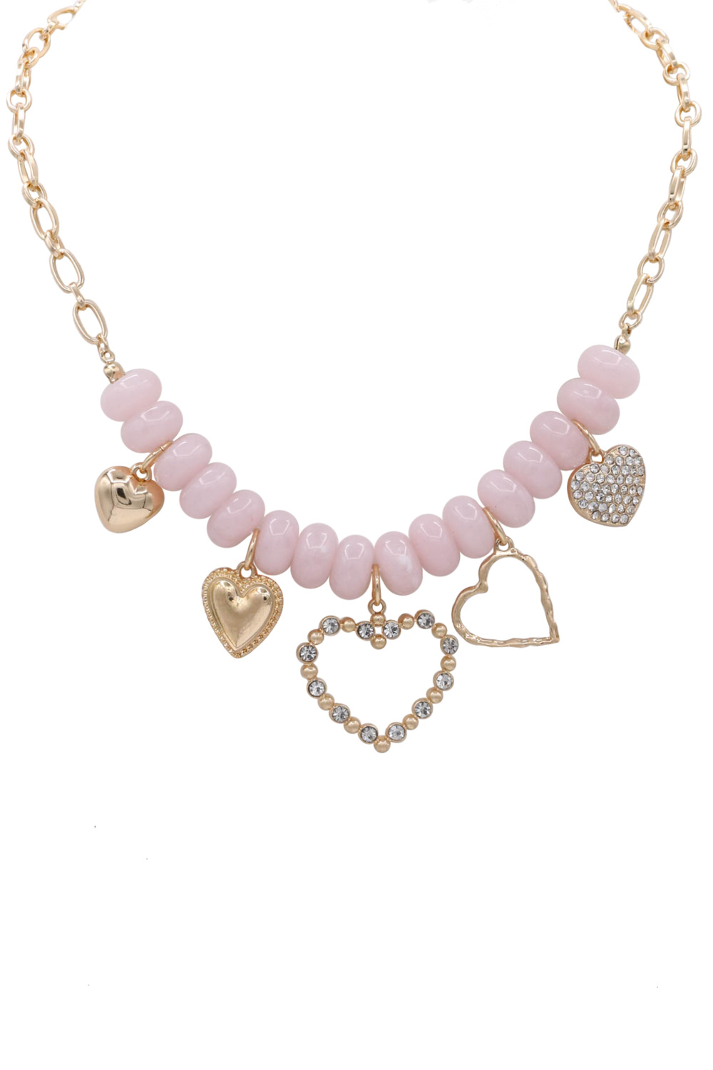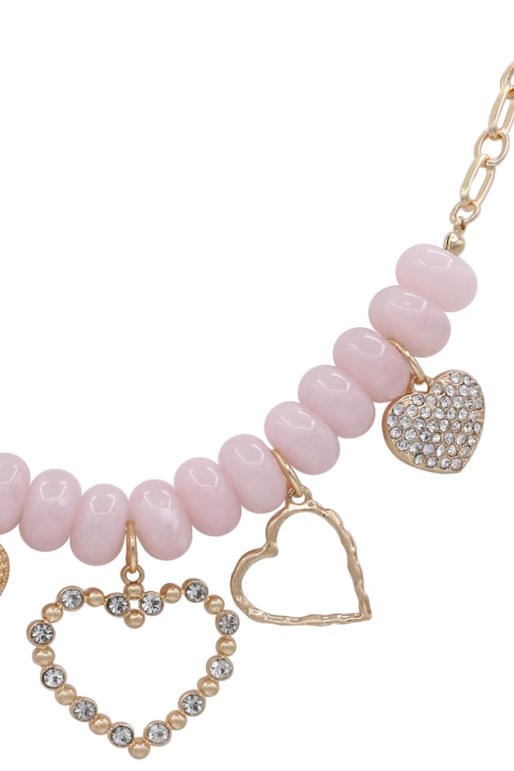 - Chic and playful, this necklace combines metal chain links with acrylic beads and heart charms for a trendy, romantic look. Ideal for layering or wearing solo.