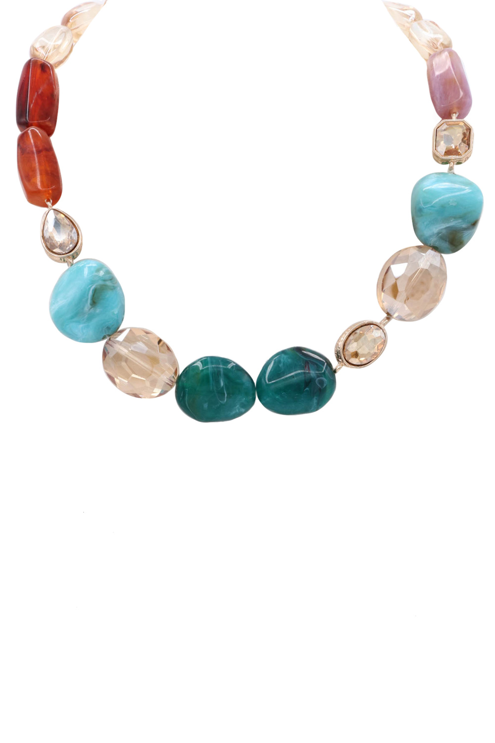 - A chic necklace featuring acrylic stones accented with jewel details for a touch of sparkle. Perfect for elevating everyday looks or adding glamour to evening wear.