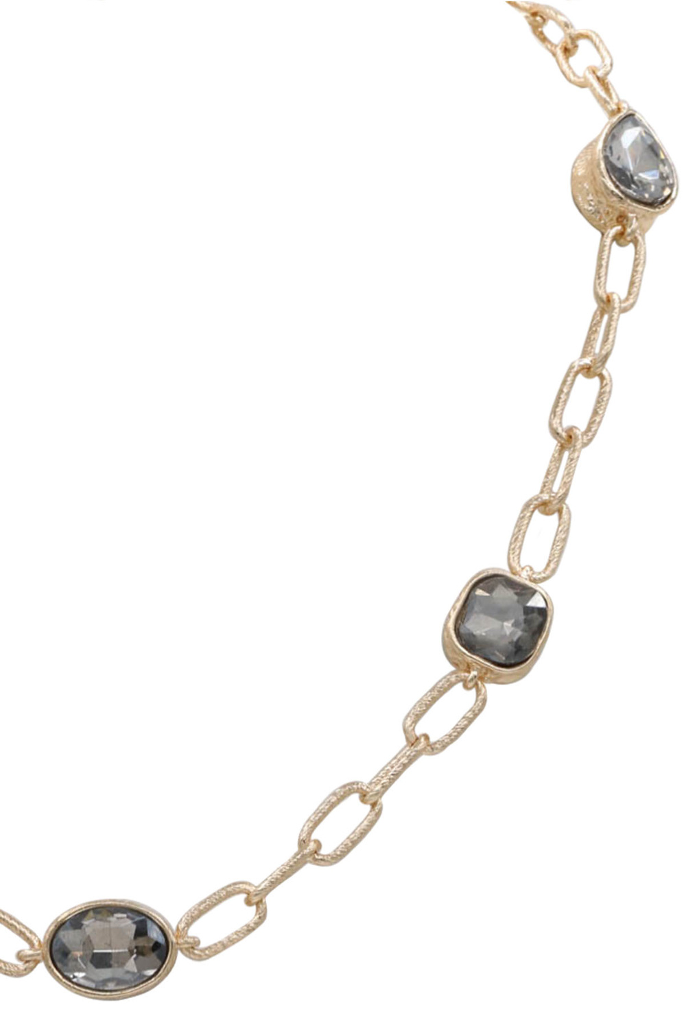 - This open chain necklace showcases two shimmering glass stones on delicate layers.