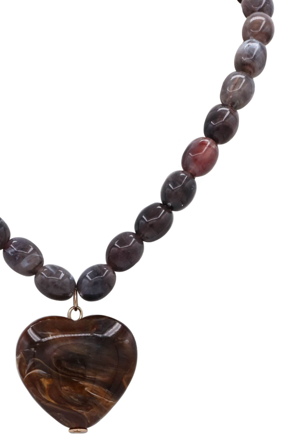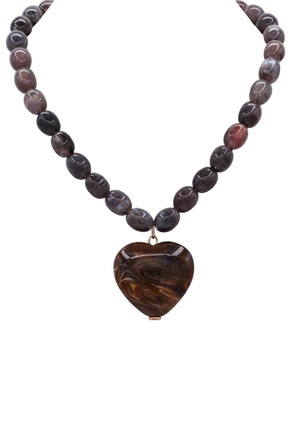 - Charming and chic - this necklace features marbled acrylic beads accented with a delicate heart pendant. A stylish blend of feminine detail and modern texture.
