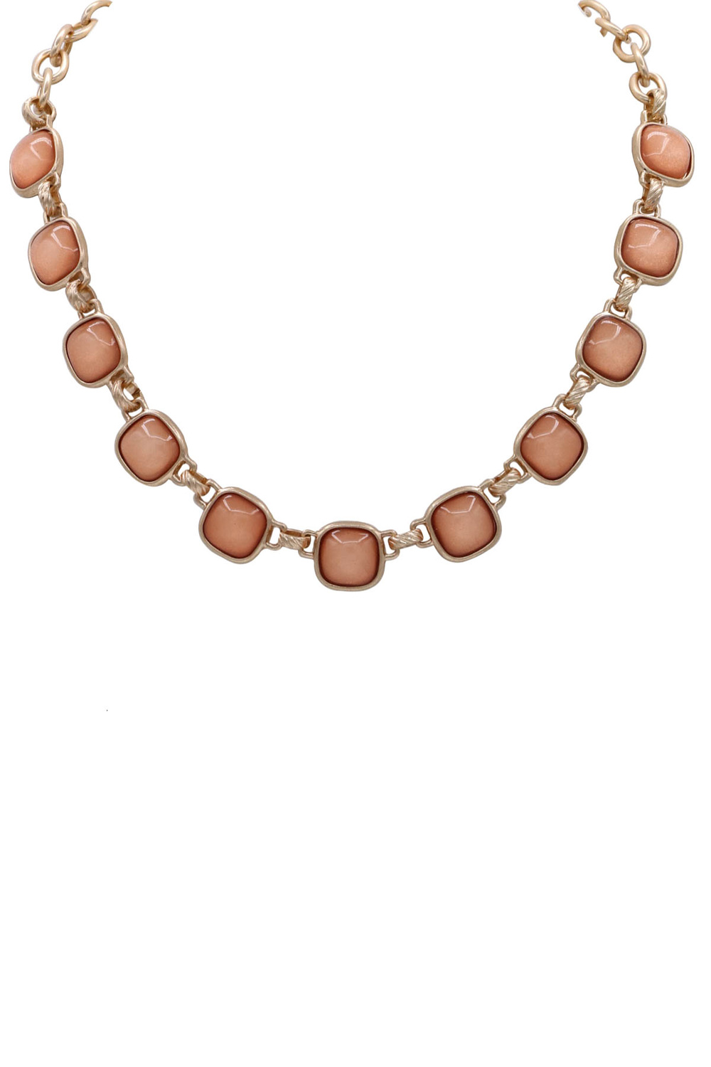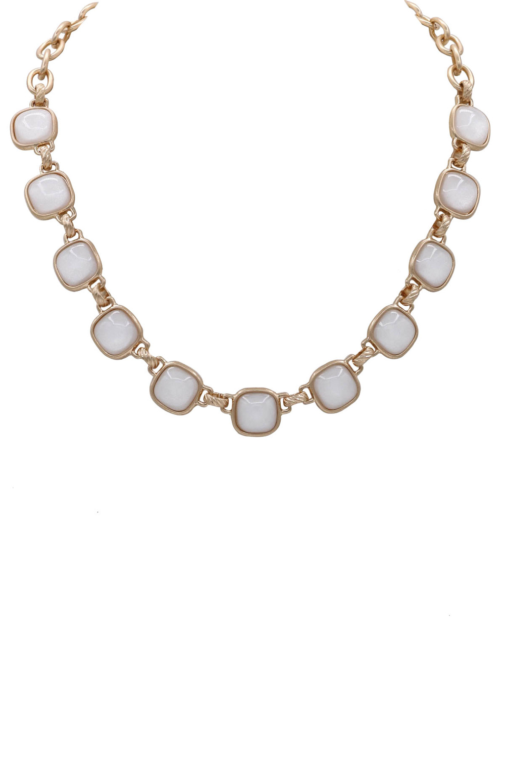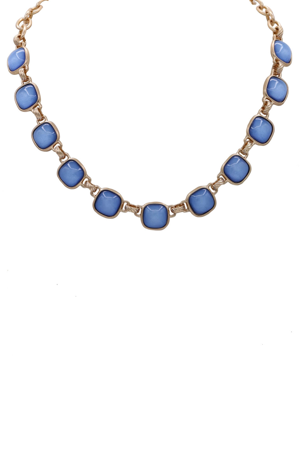 - A stylish necklace featuring linked metal accents paired with acrylic square stones for a modern, geometric look. Eye-catching and versatile, this piece adds color and dimension to elevate both everyday and statement outfits.