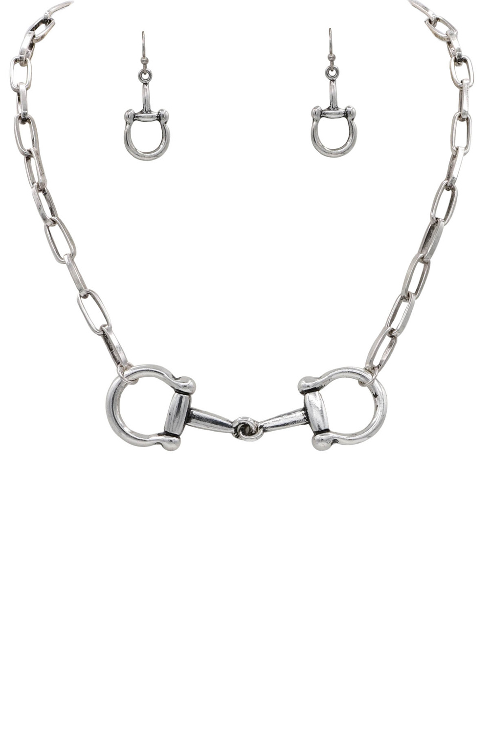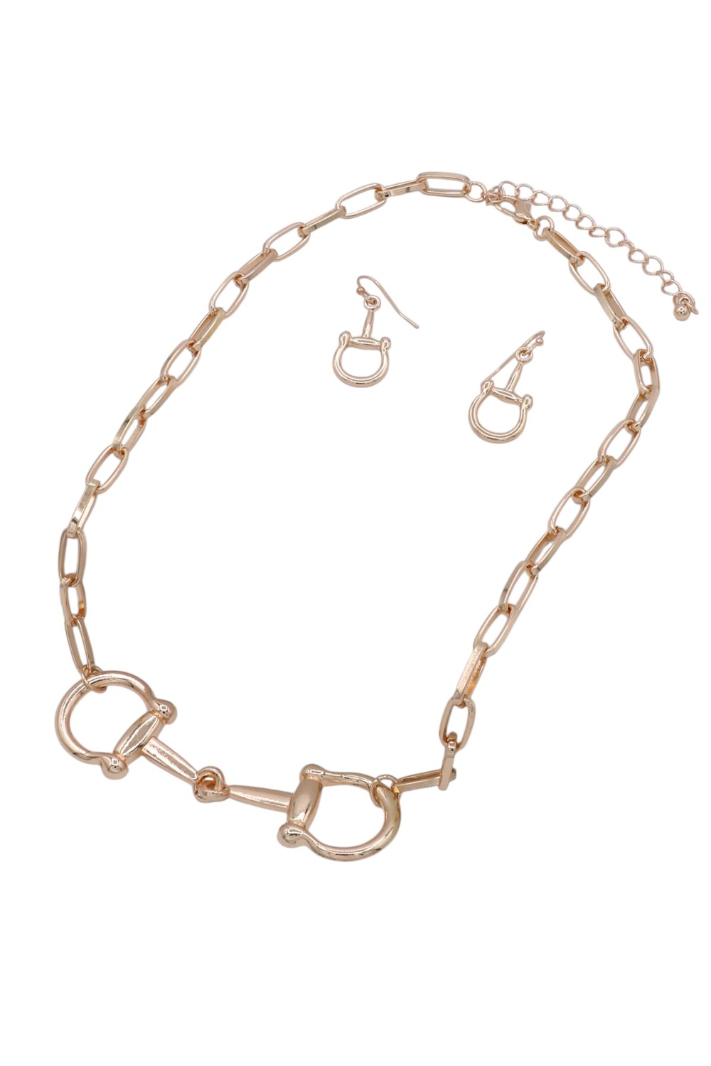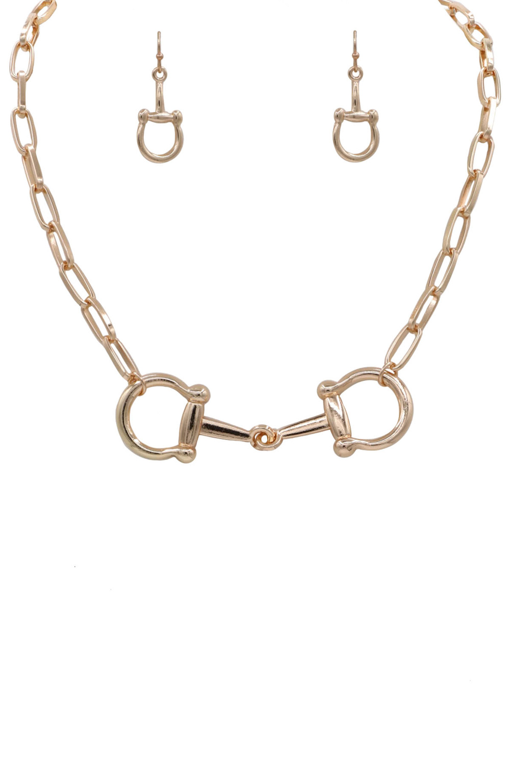 - A stylish matching jewelry set featuring a metal chain necklace and coordinating horse bit-inspired earrings. Elegant and timeless, this equestrian set adds a refined, polished touch to both everyday wear and dressy looks.