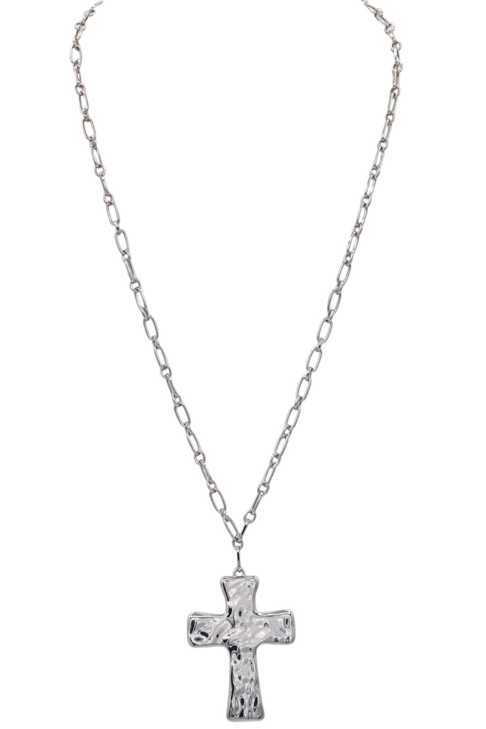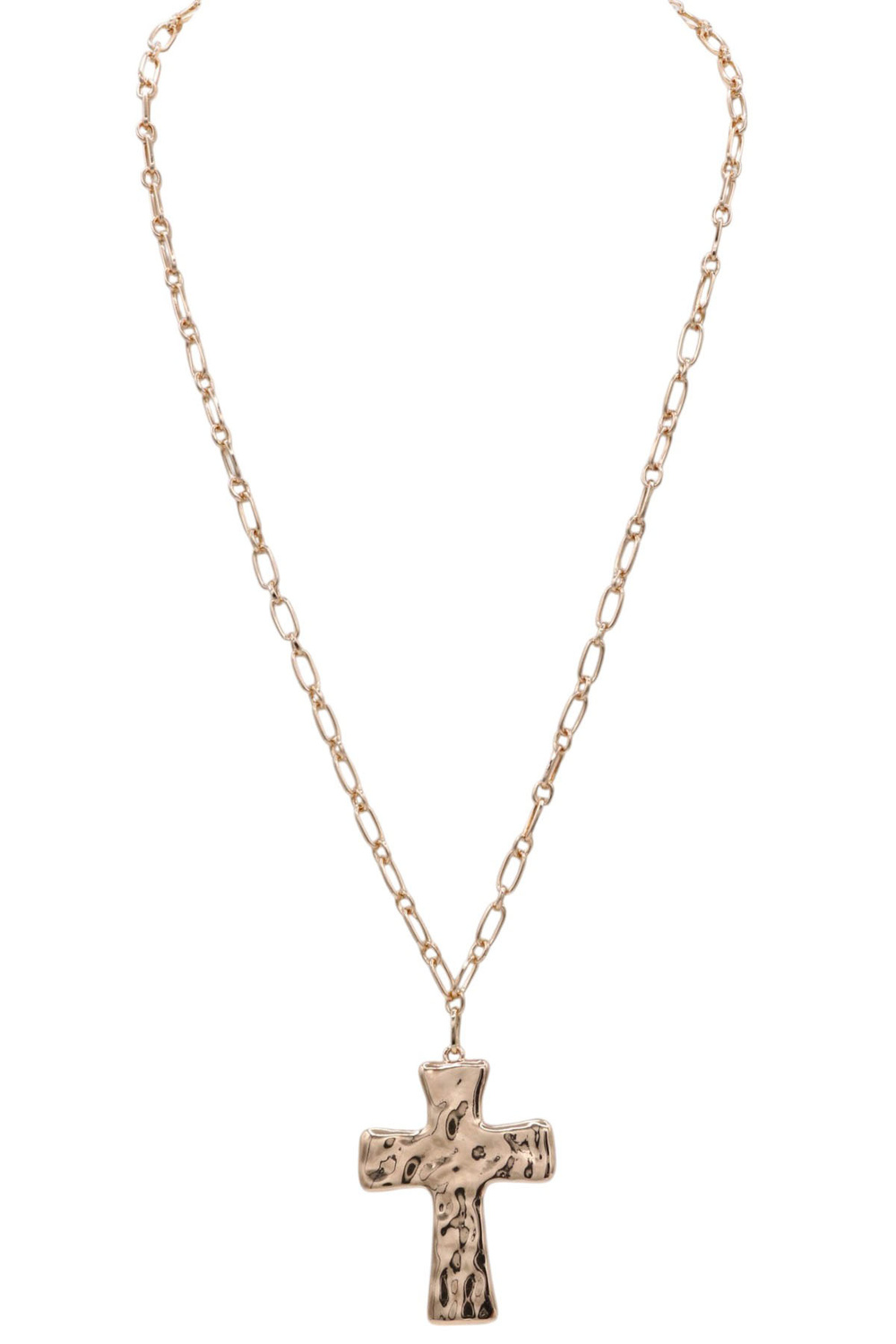 - A stylish long necklace featuring a sleek metal chain accented with a hammered cross pendant for added texture and shine. This faith-inspired piece is versatile and elegant, perfect for layering or wearing as a statement on its own.