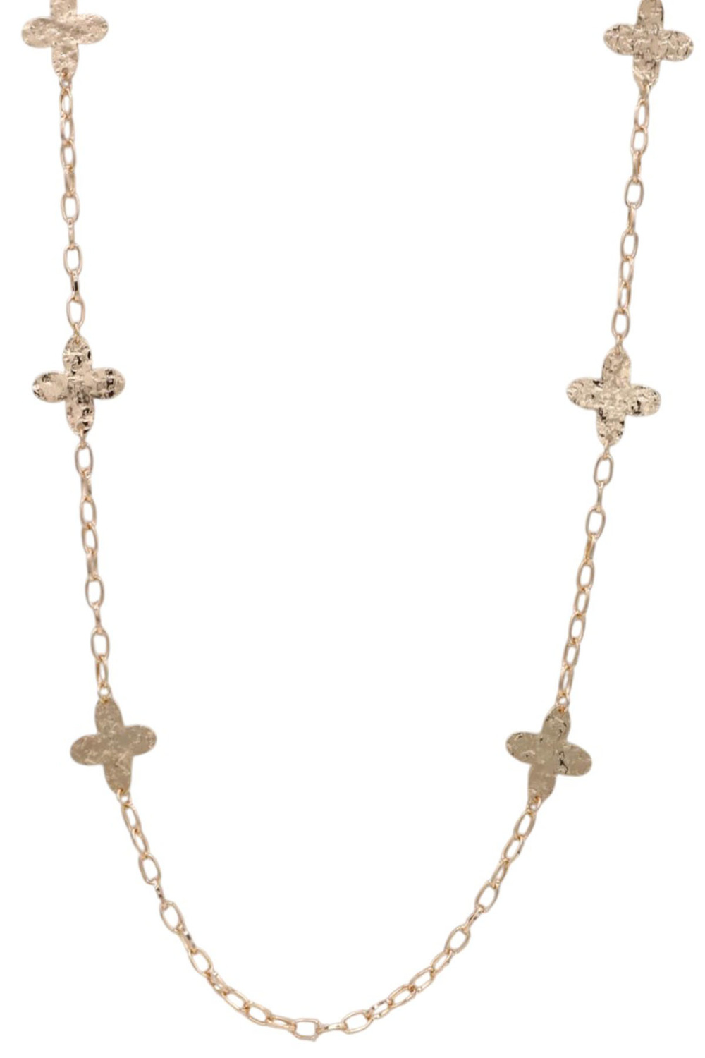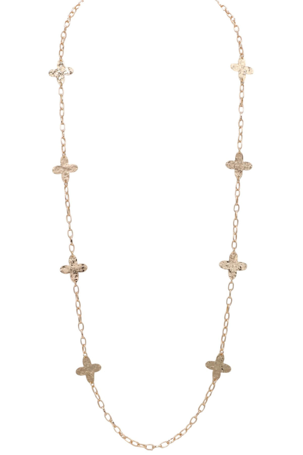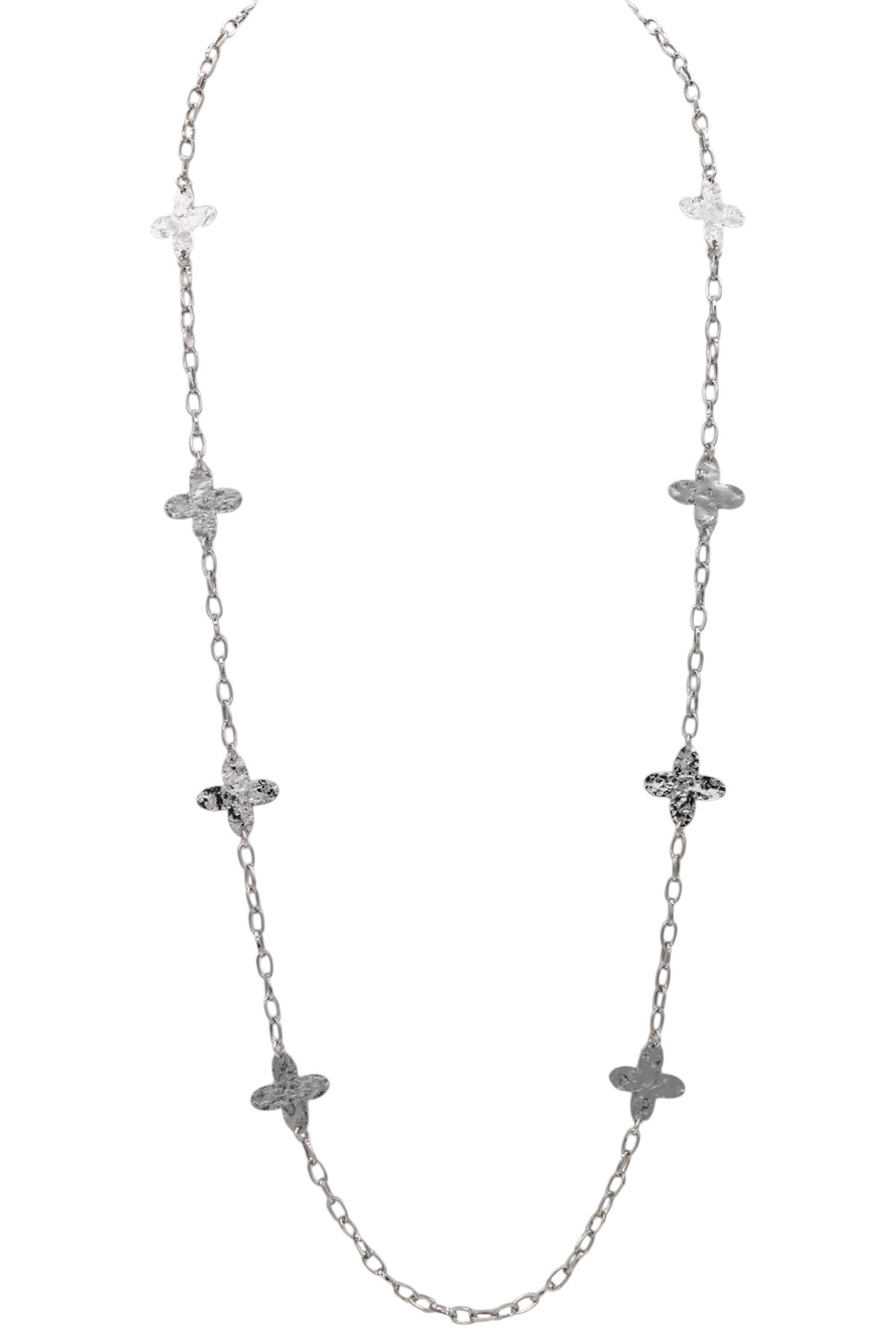 - A delicate long necklace featuring a metal chain accented with evenly spaced diamond flower station details. Elegant and versatile, this piece adds a subtle sparkle and feminine touch to both everyday and dressy looks.
