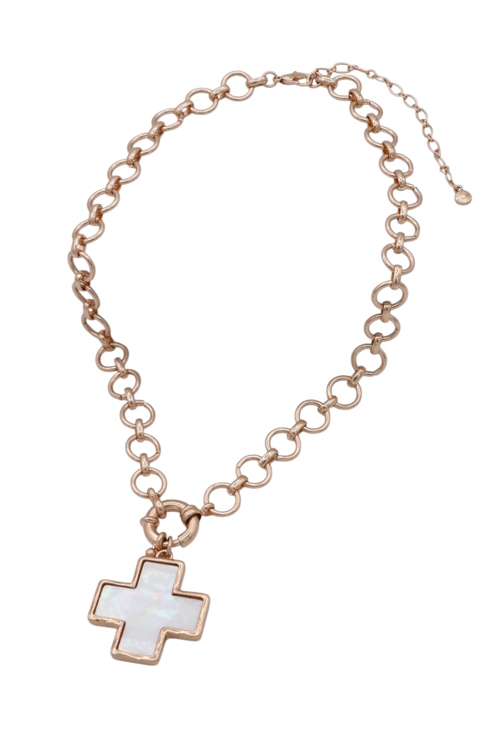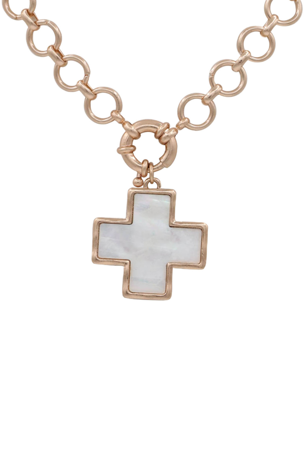 - A stylish necklace featuring bold circle link chains accented with a mother-of-pearl cross pendant. Elegant and modern, this piece adds a soft shimmer and meaningful touch to everyday or layered looks.