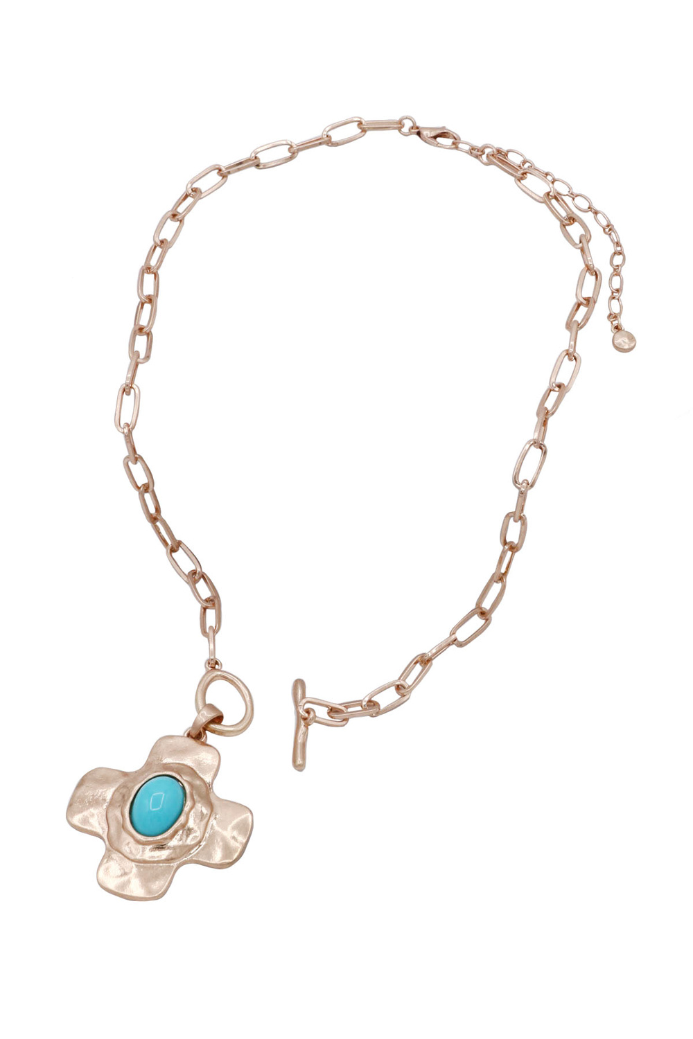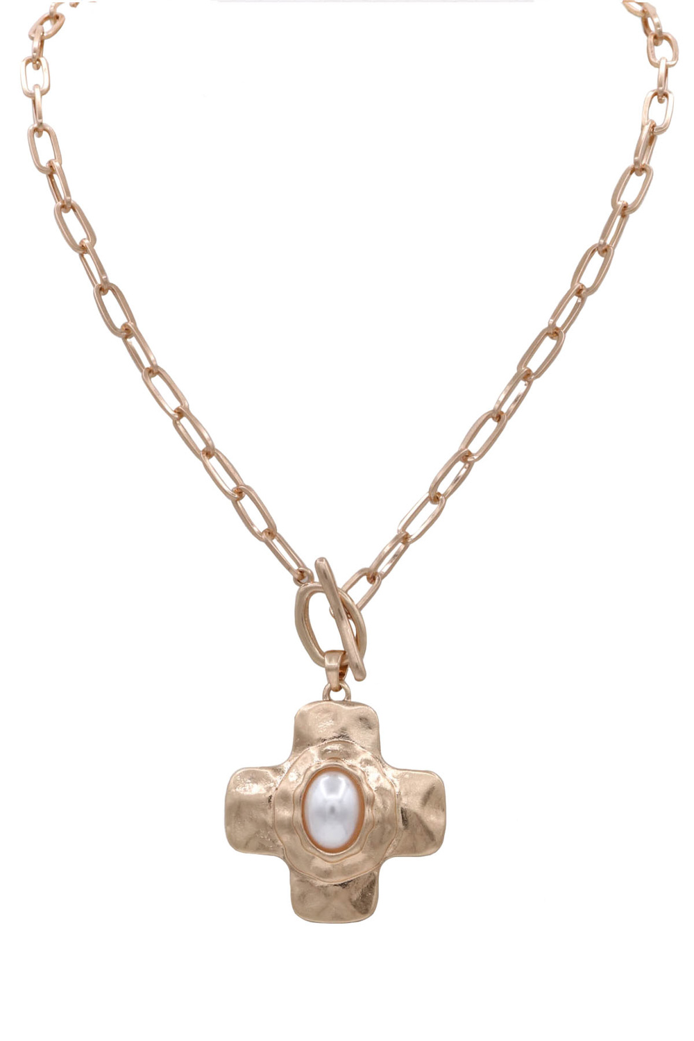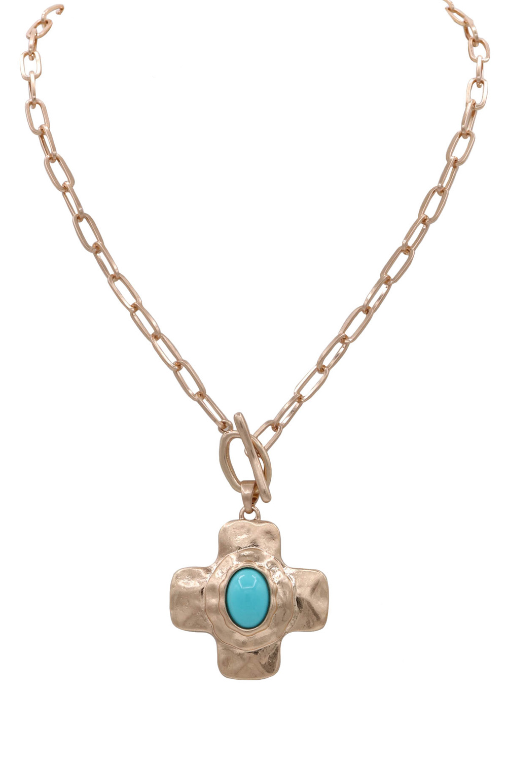 - A stylish necklace featuring a metal cross pendant paired with an acrylic stone accent and a front toggle closure. This modern faith-inspired piece adds texture, color, and a bold statement to any outfit.