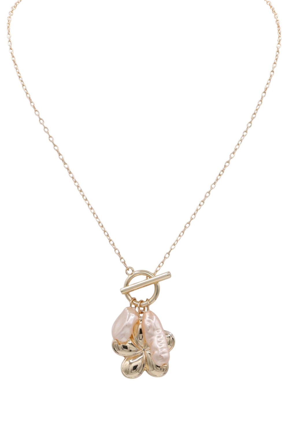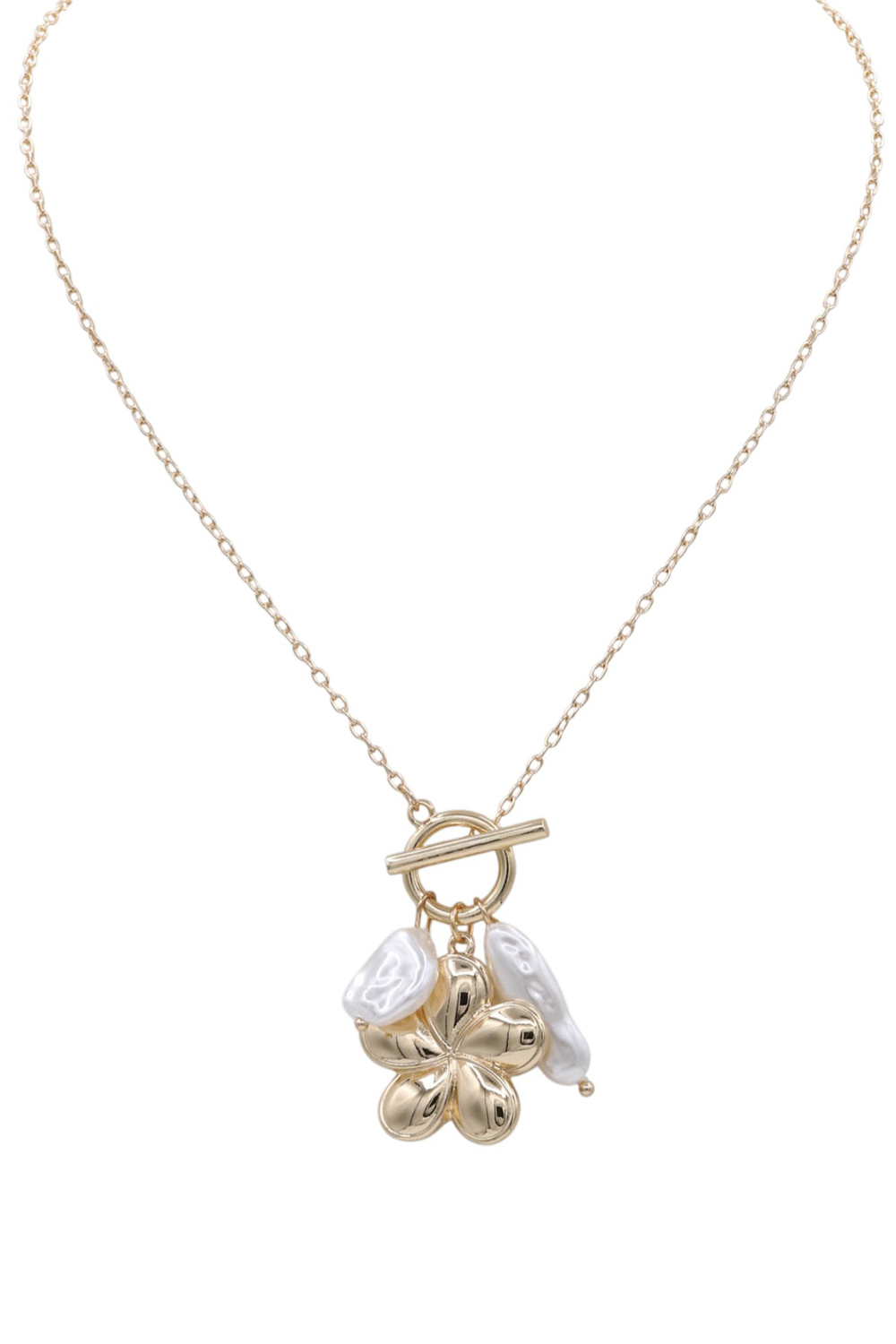 - Chic and feminine, this necklace pairs a metal flower pendant with pearl charms on a sleek chain for a soft, romantic, and layered look. Perfect for casual or dressy styling.
