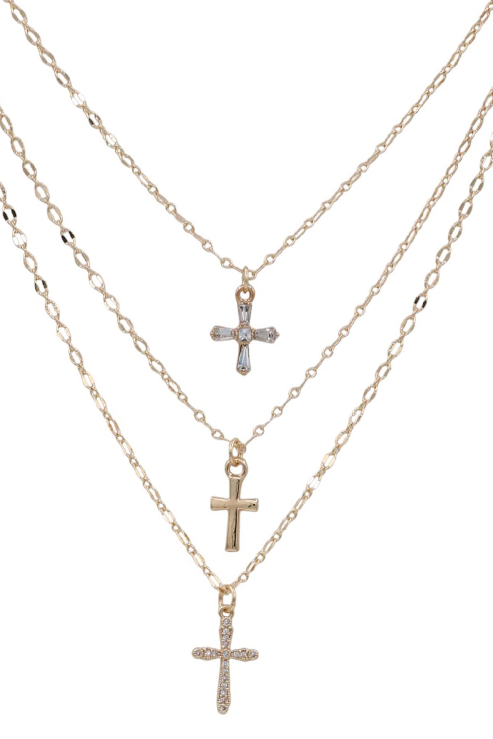 - This layered necklace showcases shimmering rhinestone-studded cross charms on sleek metal chains, offering a stylish blend of sparkle and simplicity.