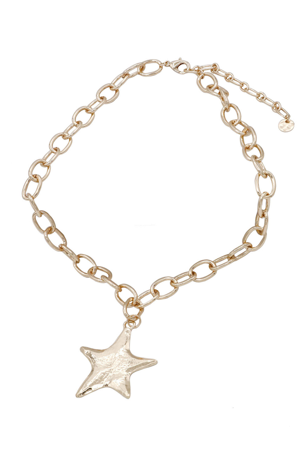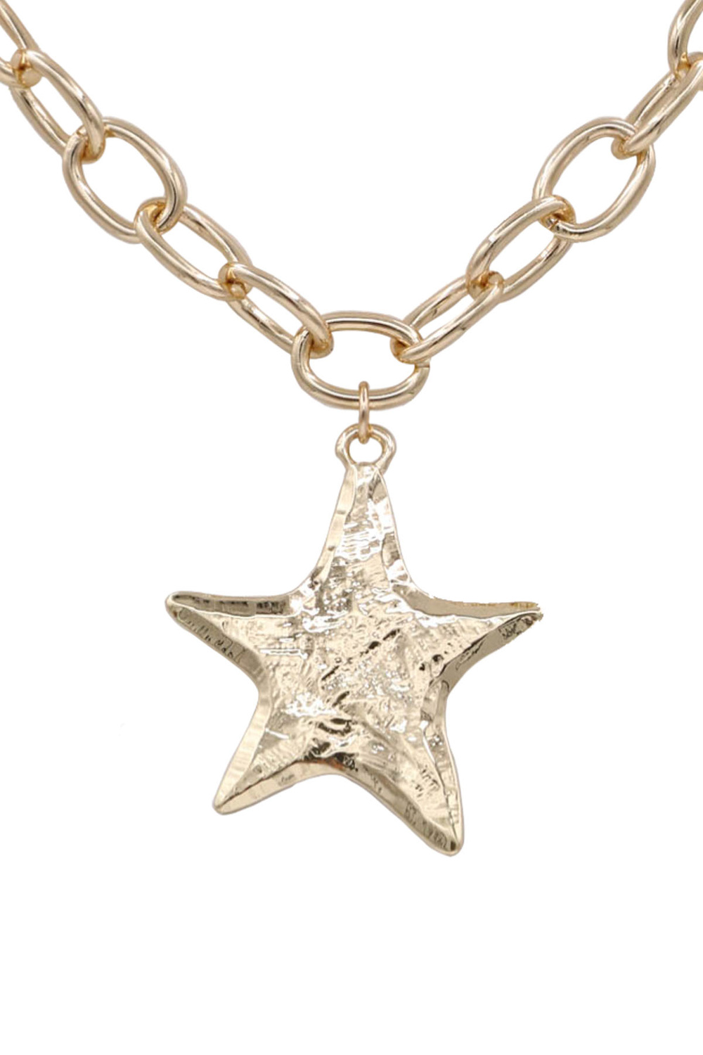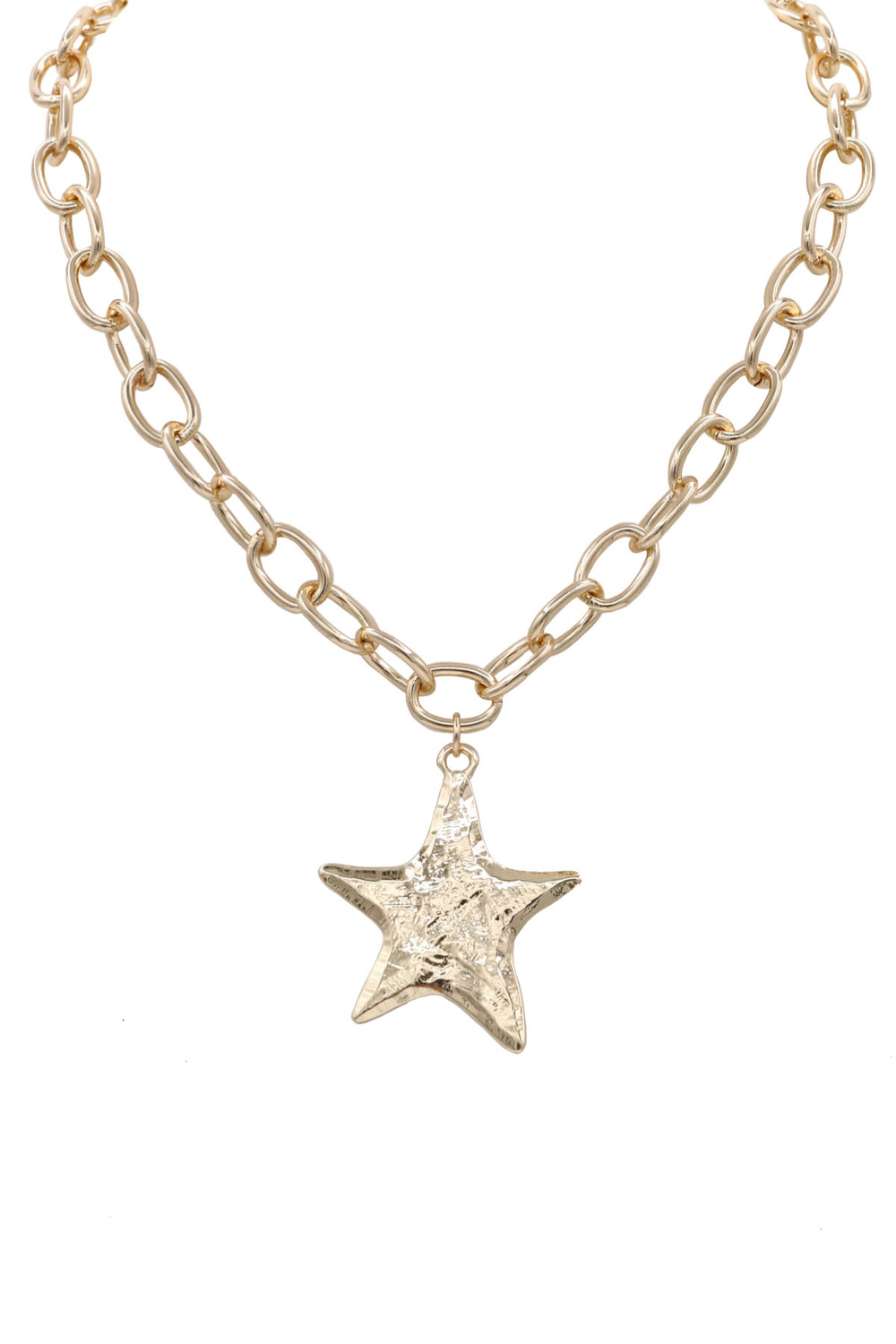 - A stylish necklace featuring a textured metal star pendant on a sleek chain. This eye-catching piece adds a subtle celestial touch and modern shine to both everyday and dressy looks.