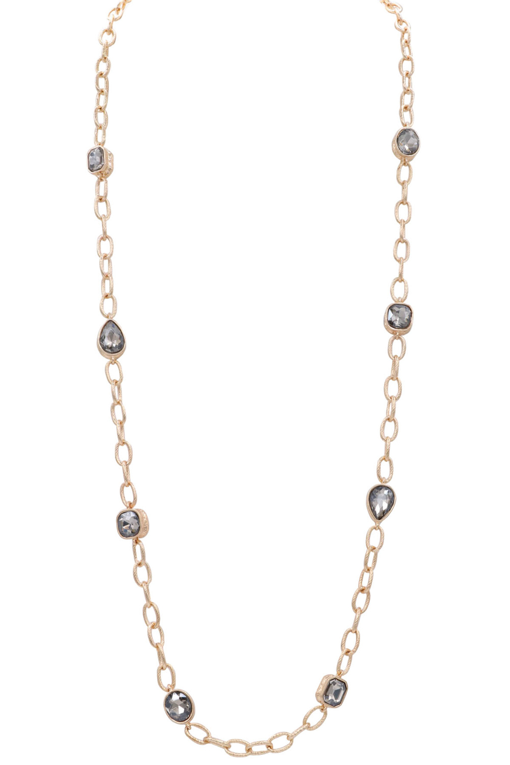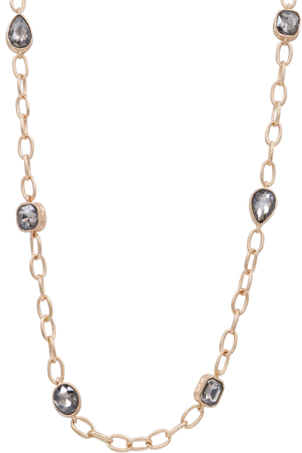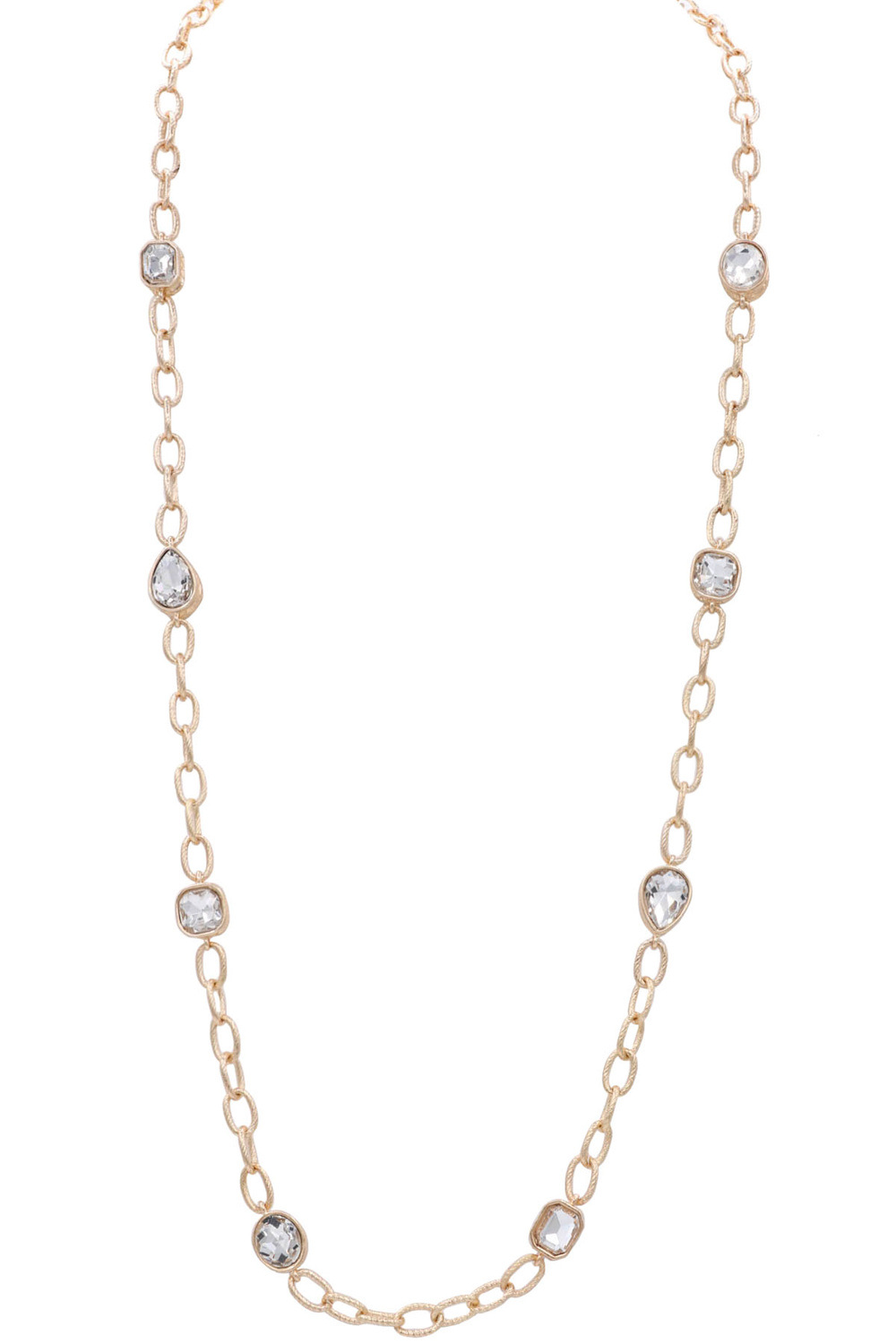 - This sleek necklace combines a textured metal chain with faceted glass stone details for a touch of sparkle and edge.