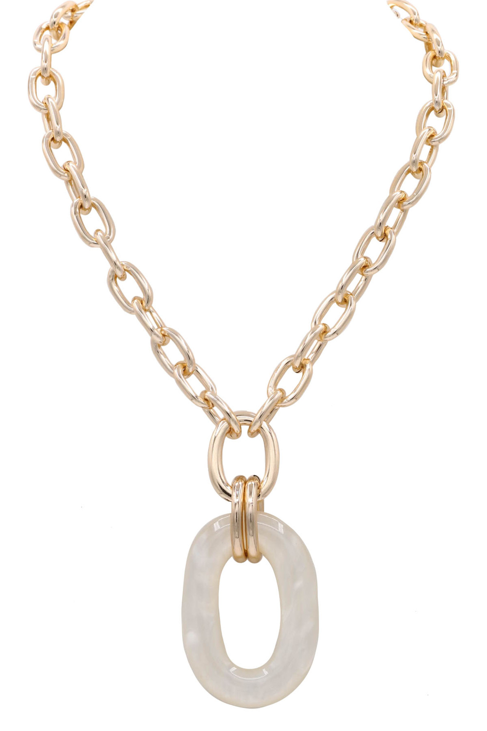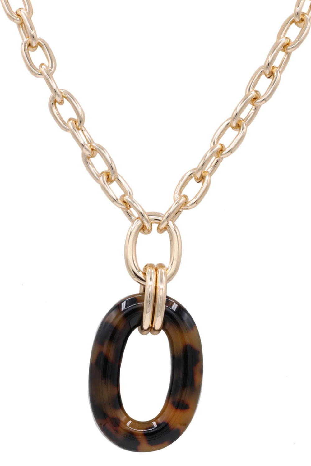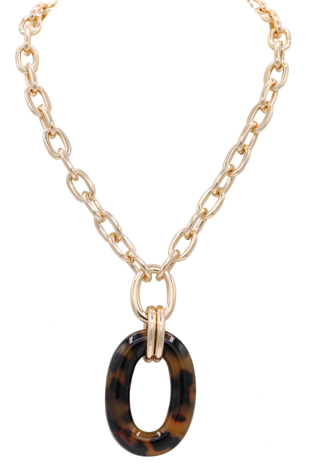 - Contemporary necklace combining a polished metal chain with an eye-catching acetate oval pendant. Adds a sophisticated touch to any outfit.
