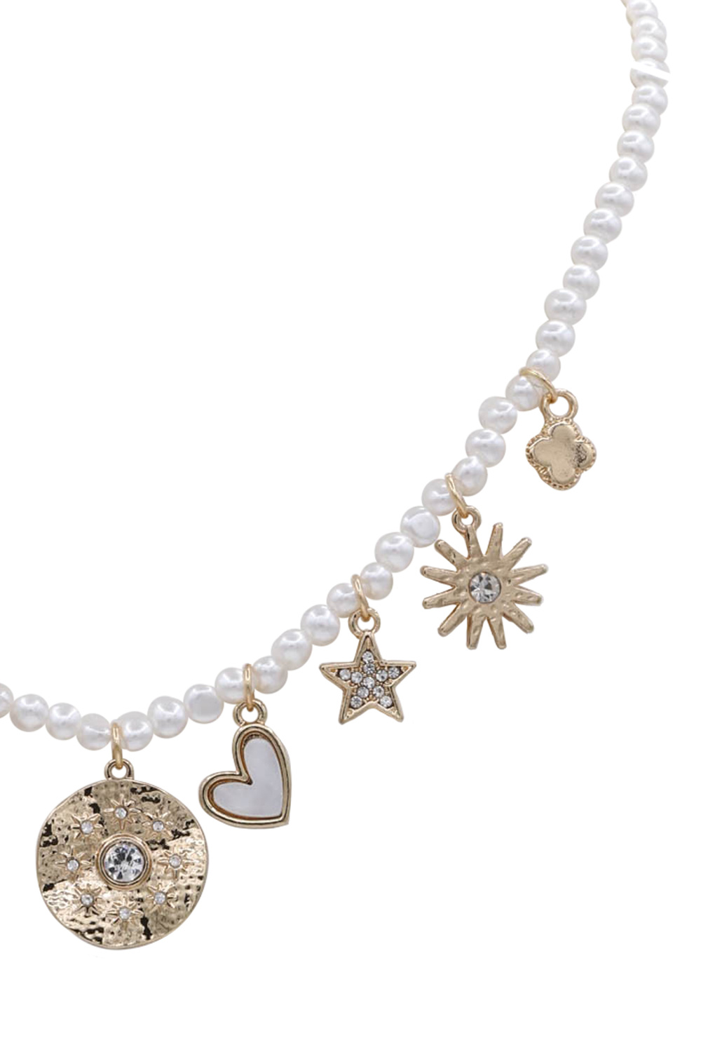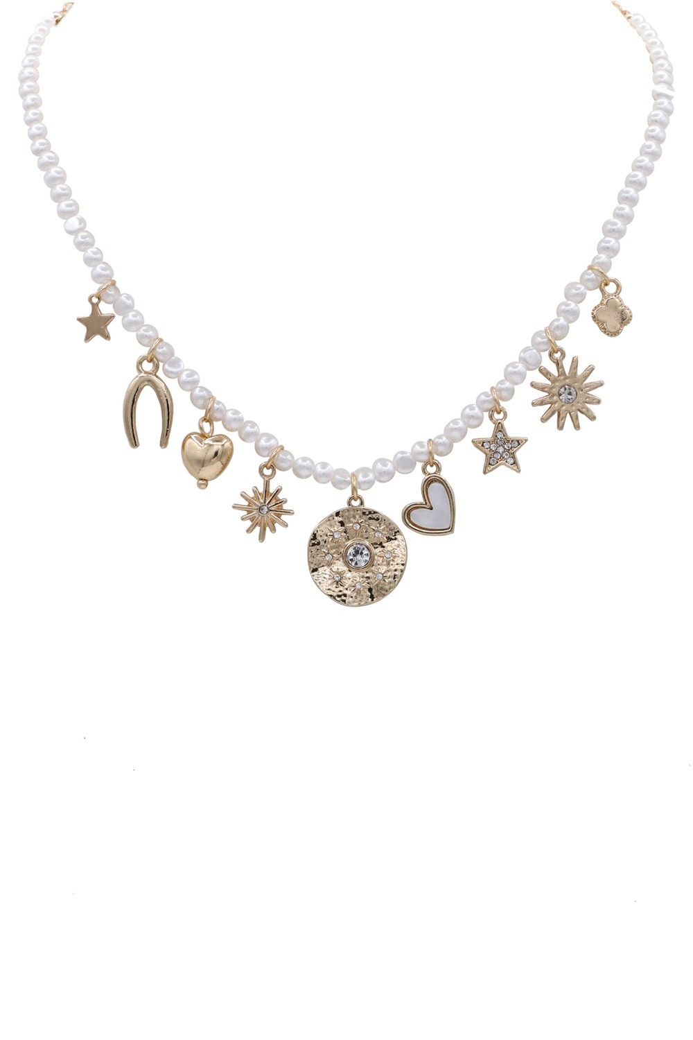 - This exquisite pearl necklace is a captivating blend of classic elegance and contemporary charm. Each charm is meticulously crafted, showcasing a variety of symbols that add personality and flair. This necklace is a celebration of individuality and a nod to timeless style, making it a must-have addition to any discerning jewelry collection.