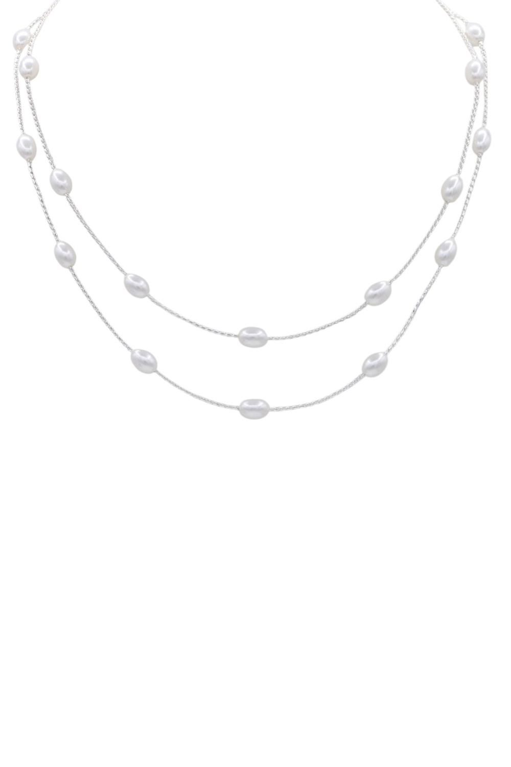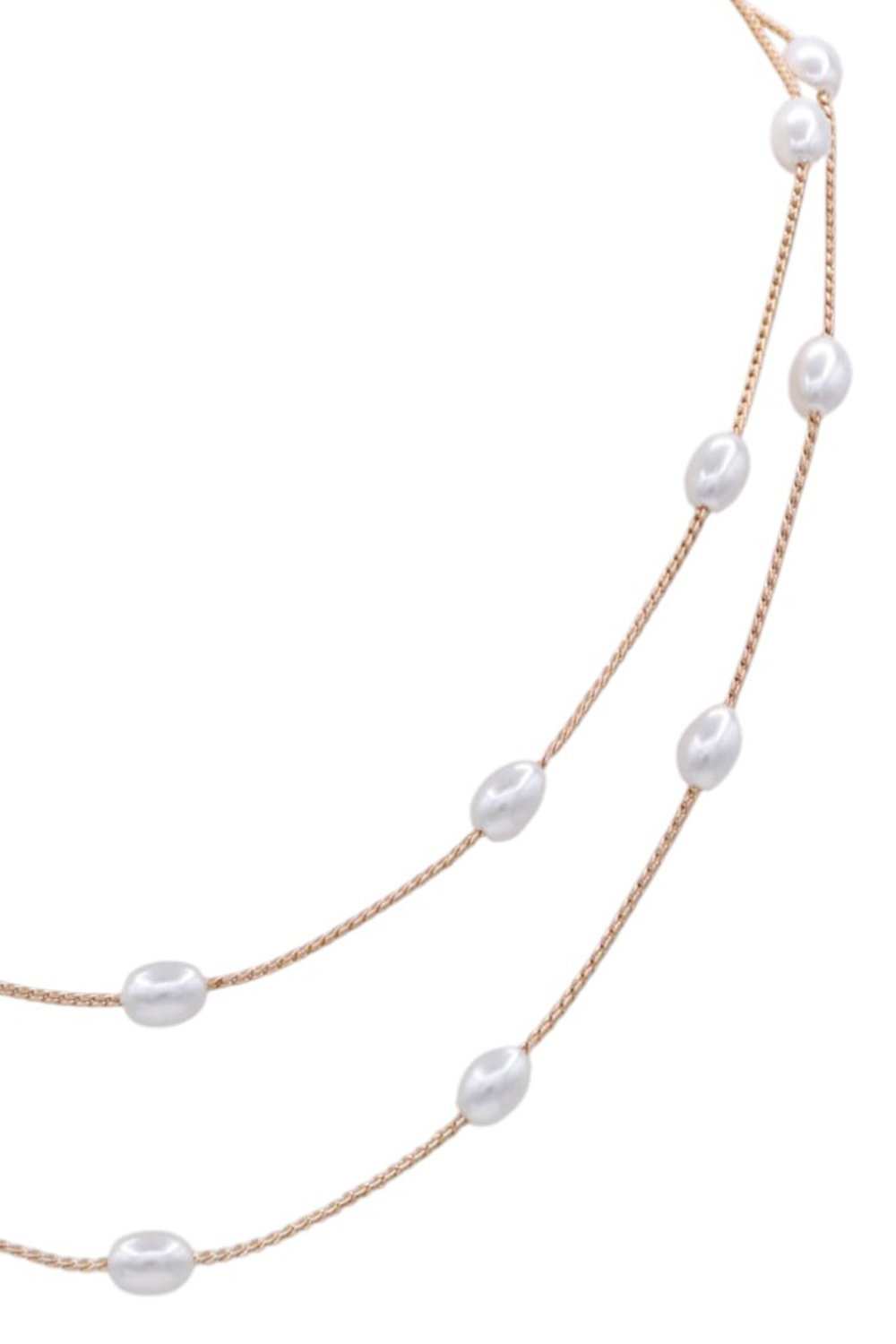 - This exquisite layered necklace embodies timeless elegance and contemporary style.It is adorned with lustrous, oval-shaped pearls spaced gracefully along each strand. The dual-layer design adds a sophisticated dimension, allowing the pearls to cascade beautifully, creating a captivating visual effect. Its ability to complement various necklines and styles makes it an indispensable part of a curated wardrobe, promising to elevate any ensemble with its understated charm and inherent elegance.