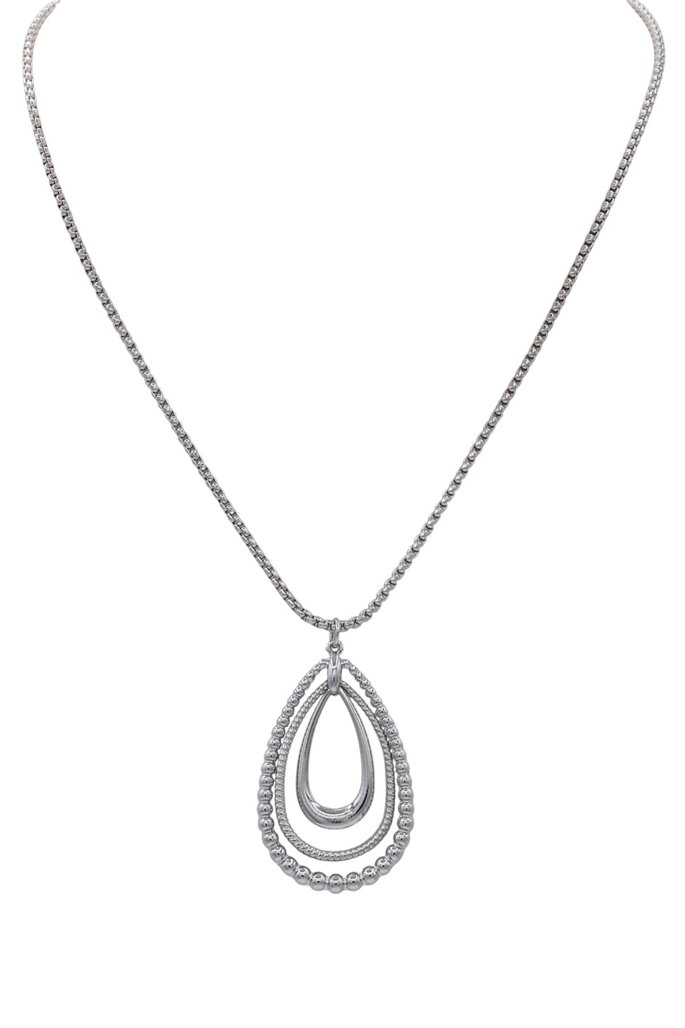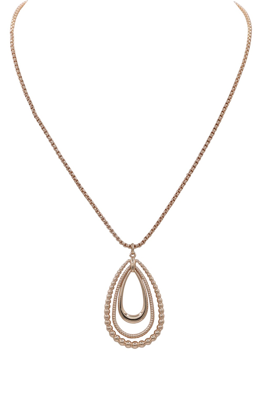 - Bold and contemporary, this triple-layered necklace combines varied textures with teardrop shapes for a statement accessory. Perfect for elevating both casual and dressy looks.