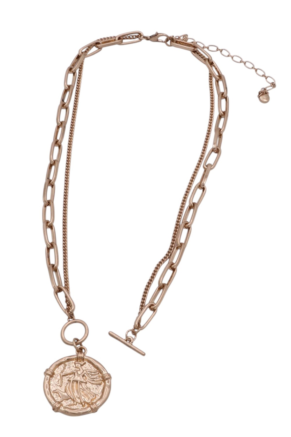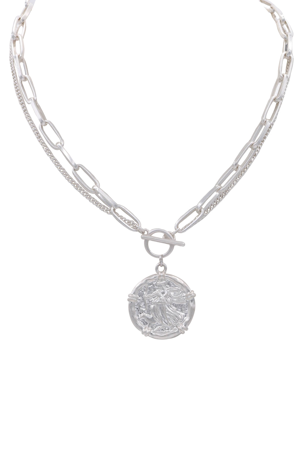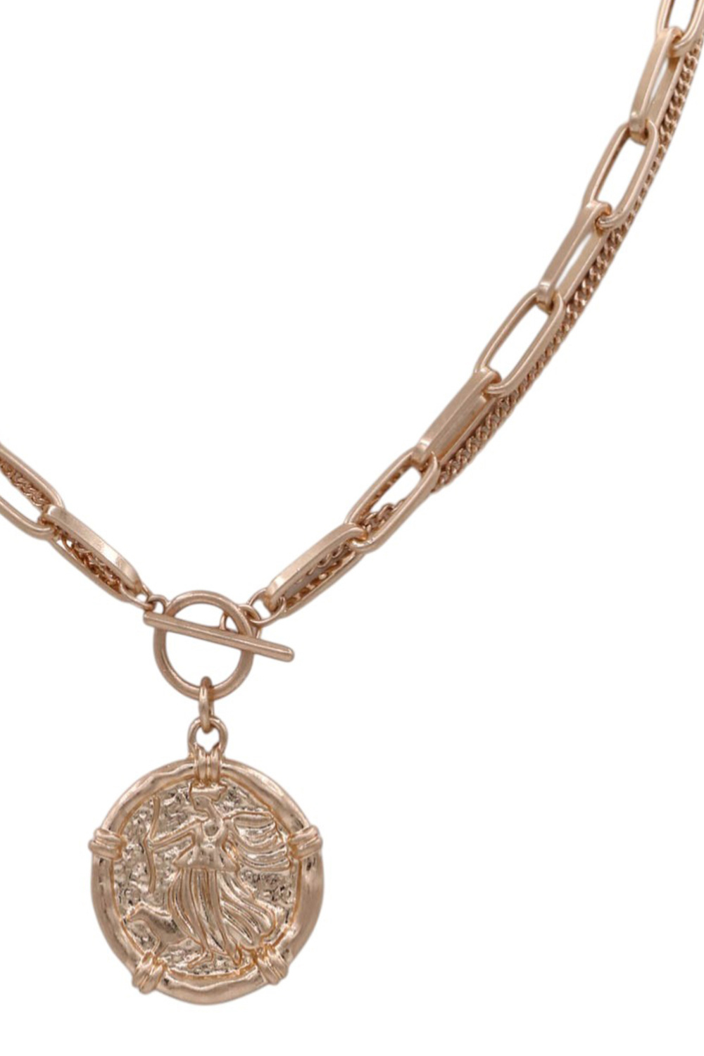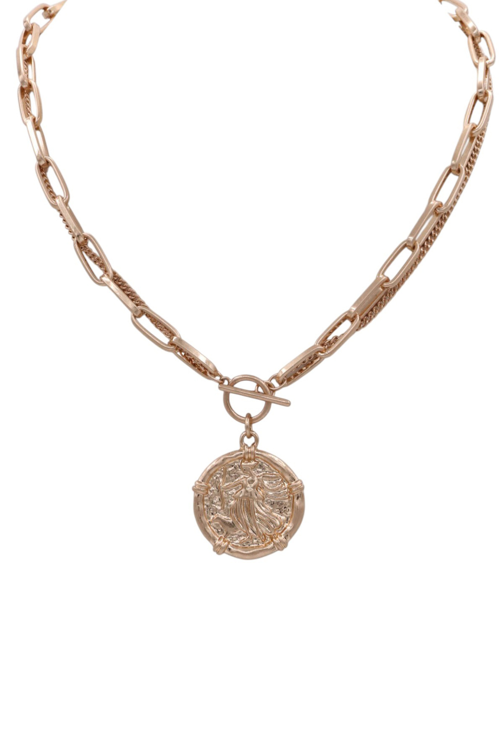 - A modern necklace featuring a sleek paperclip chain accented with a coin charm and a front toggle closure. Stylish and versatile, this piece adds a contemporary touch and effortless polish to any outfit.
