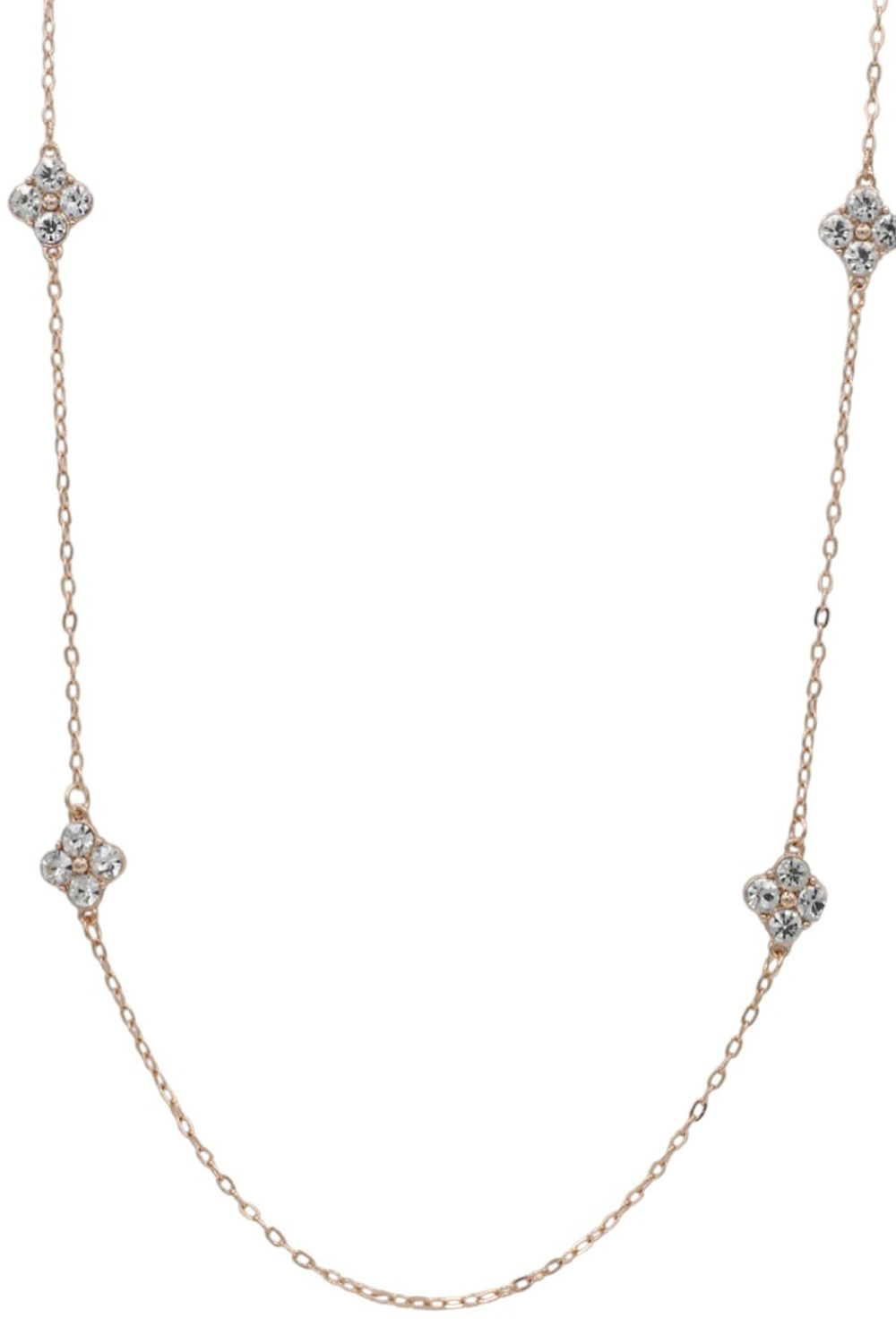 - Long metal necklace featuring a sparkling rhinestone clover charms. Adds a touch of elegance and luck to any outfit.