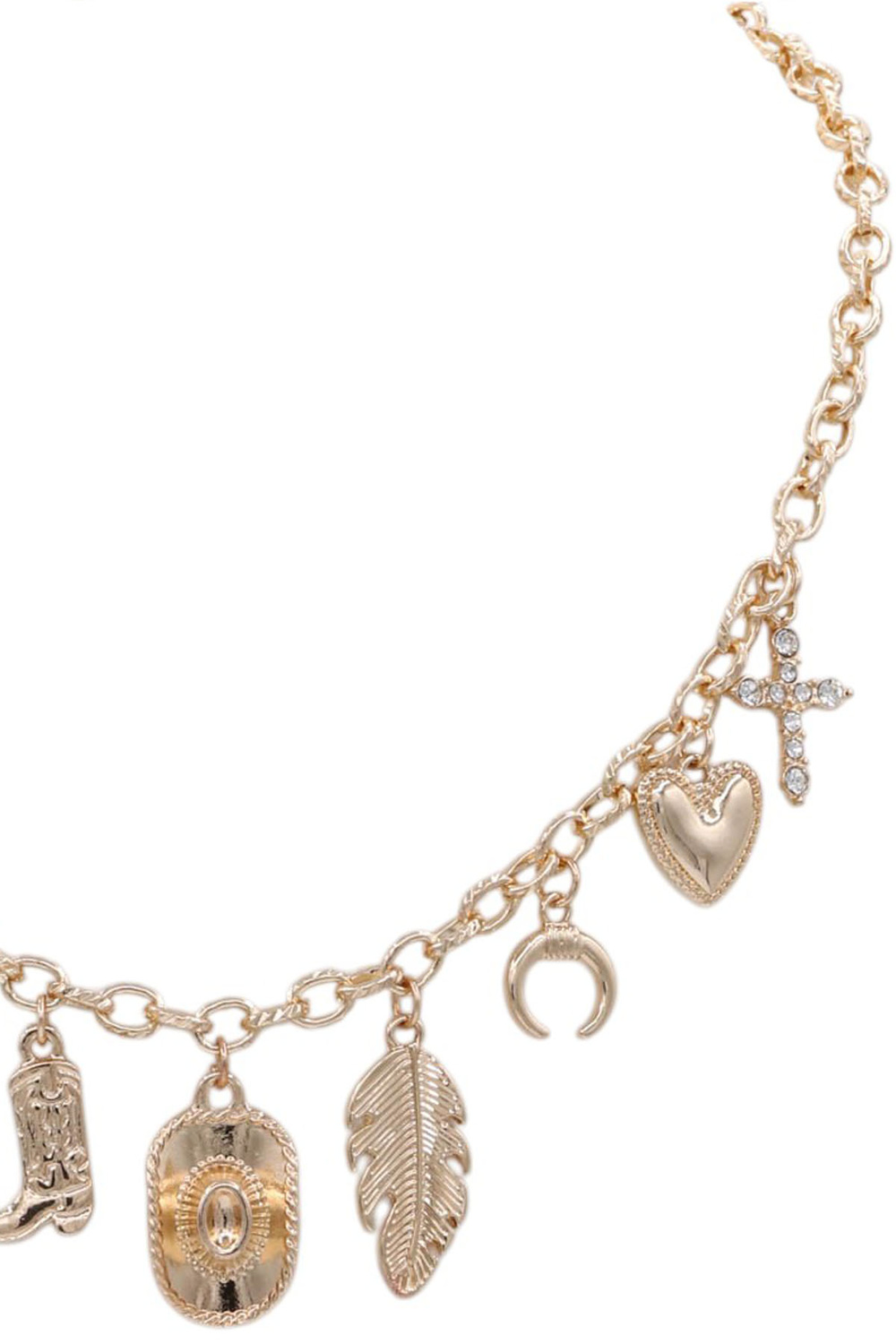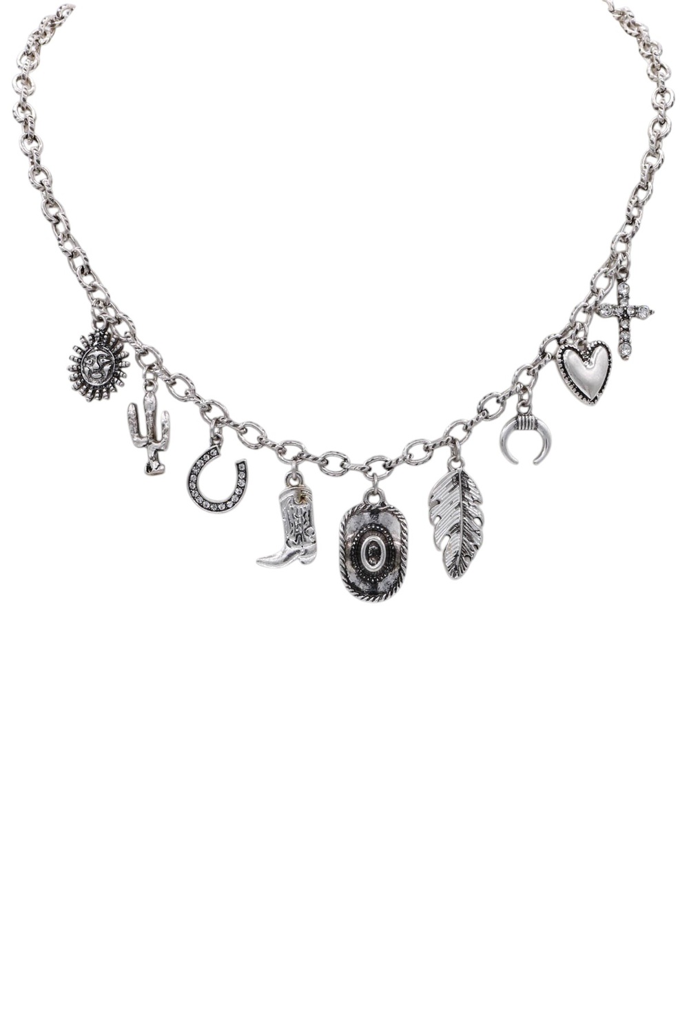 - Metal western charm necklace featuring a mix of iconic western pendants on a chain. Stylish and rustic, perfect for everyday western flair.